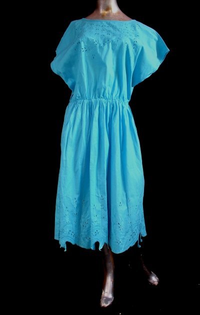 Letnia sukienka w pięknym,intensywnym niebieskim kolorze.Rozmiar L.Materiał bawełna..Odcięta w pasie,ściągnięta gumką.Rękaw małe kimono.Tył wycięty w literę V,zapinany na guziki.Po bokach dwie kieszenie.Przód ozdobiony haftem angielskim.Stan bardzo dobry.Długość 117 cm.pod pachami 118 cm.obniżone.
