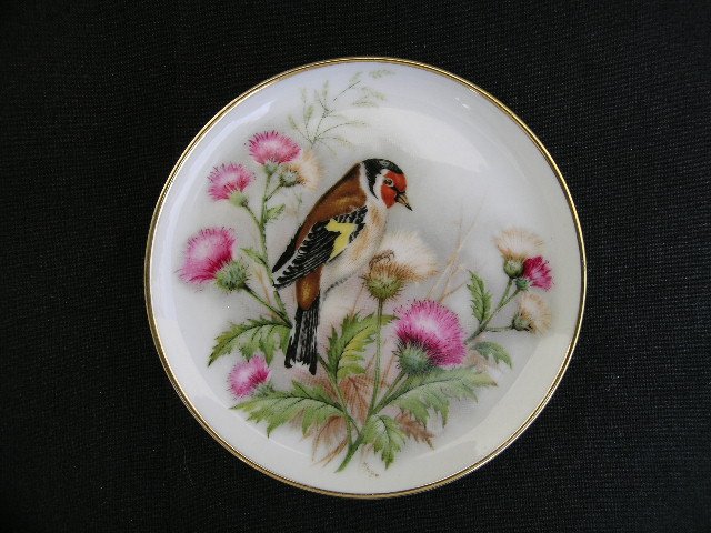 Porcelanowy spodek-talerzyk, sygnowany jakością niemieckiej manufaktury Kaiser. Piękna, żywo-barwna malatura ptasio-łąkowa :) Rant złocony. Porcelana szlachetna, biała. Użytkowy. 10 x 1 cm. Stan zachowania bardzo dobry.