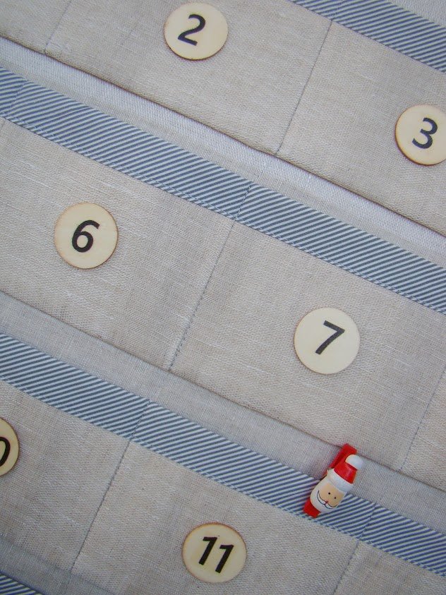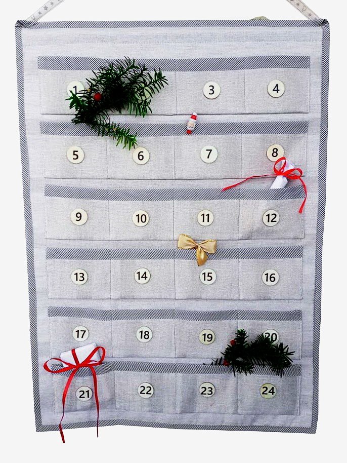 Kalendarz adwentowy wykonany z lnu.. Kieszonki i lamówka z bawełny w szaro - białe (paseczki. Lekko usztywniony. niezwykle oryginalną ozdobą twojego domu. Wymiary; 70 x55cm , kieszonka ok. 10 x 11