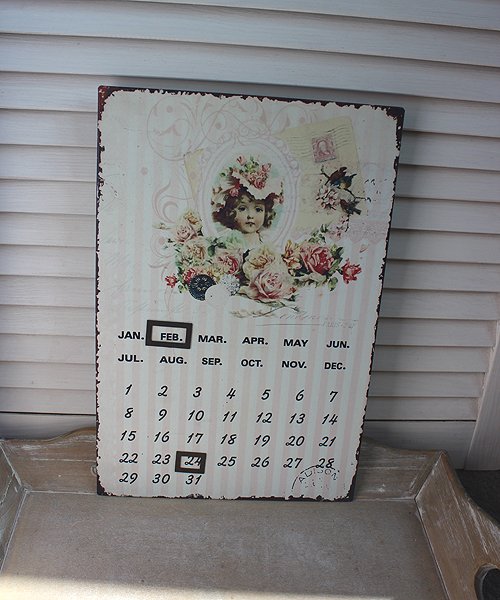Piękny nowy metalowy kalendarz - Dziewczynka i róże. Uniwersalny - nie tylko na jeden rok. Do kalendarza dołączone są dwie rameczki - magnesy, dzięki którym można zaznaczyć dzień miesiąca oraz miesiąc. Kalendarz w stylu retro, vintage.
