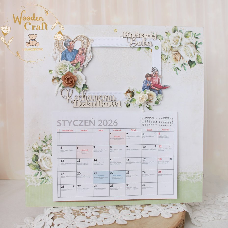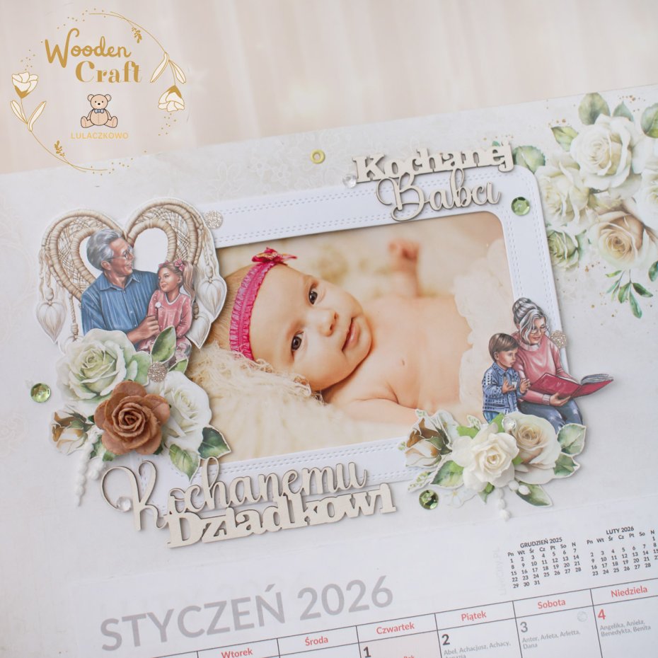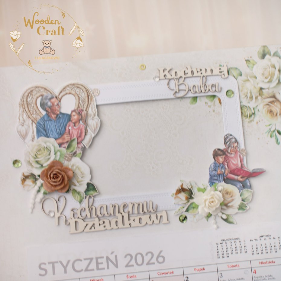 Piękny, ręcznie robiony kalendarz z miejscem na zdjęcie, idealny jako prezent na Dzień Babci Dziadka, utrzymany w odcieniach beżu, bieli i zieleni, wykonany z cudownej kolekcji papierów "White Roses". Kalendarz wykonany ręcznie z dbałością o każdy szczegół, ozdobiony grafikami babci z wnuczkiem oraz dziadka z wnuczką, kompozycjami kwiatowymi z papierowymi różyczkami, dodatkowo zdobiony połyskującymi cekinami, oraz tekturkowymi napisami "Kochanej Babci" i "Kochanemu Dziadkowi".