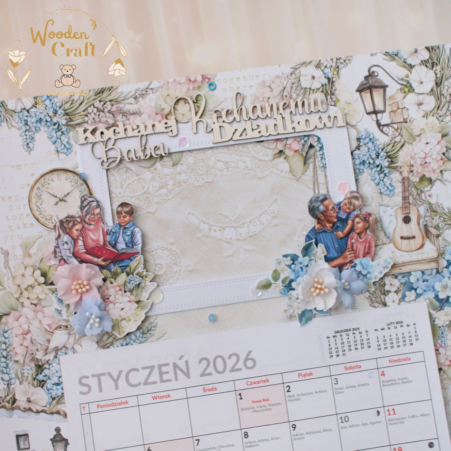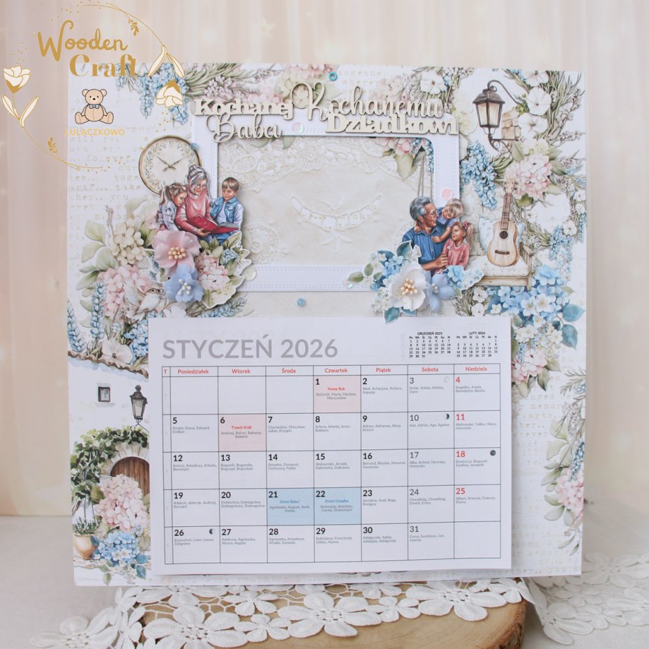 Piękny, ręcznie robiony kalendarz z miejscem na zdjęcie, idealny jako prezent na Dzień Babci Dziadka, utrzymany w odcieniach bieli, błękitu i różu, wykonany z cudownej kolekcji papierów "Cottage Heart". Kalendarz wykonany ręcznie z dbałością o każdy szczegół, ozdobiony grafikami babci oraz dziadka z wnuczętami, kompozycjami kwiatowymi z ręcznie robionych kwiatów, dodatkowo zdobiony połyskującymi cekinami, oraz tekturkowymi napisami "Kochanej Babci" i "Kochanemu Dziadkowi".