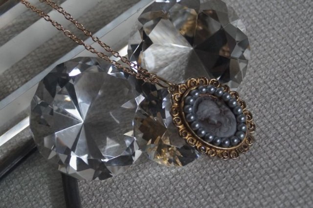 Piękny naszyjnik vintage w zlocistym metalu.Ogromna kamea.Zdobiona perelkami.