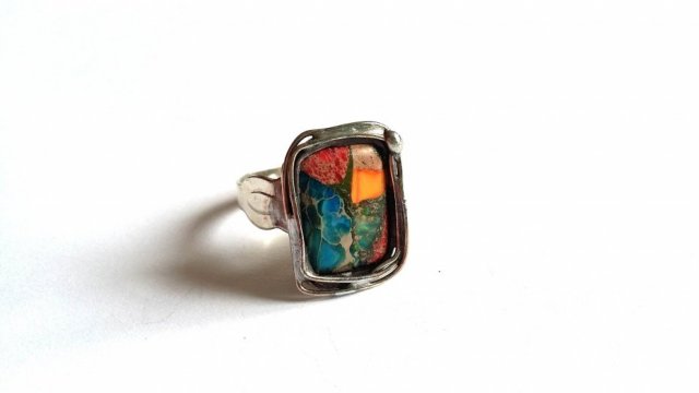 Pierścionek wykonany z miedzi, cyny i jaspisu. Wymiary ok. 1,5 na 1,2 cm. Obrączka posrebrzana, regulowana.