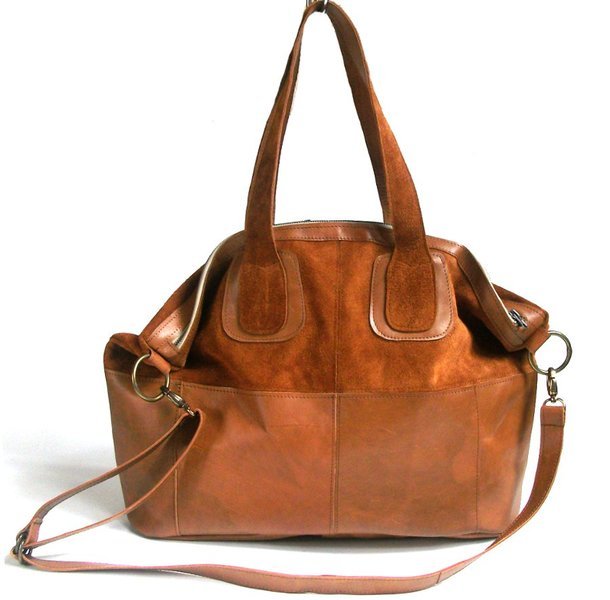 Duża karmelowa torba powstała ze skóry naturalne gładkiej (dół i dno) oraz zamszu (góra )