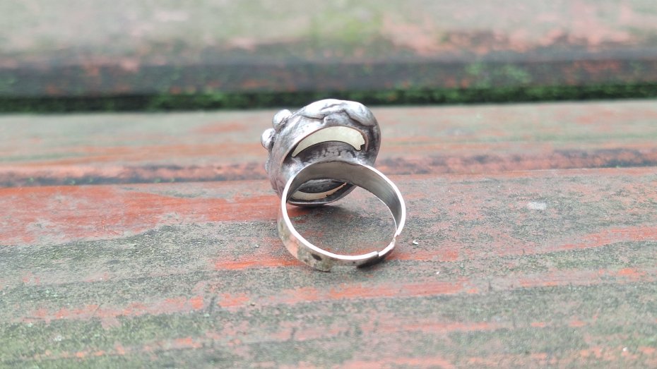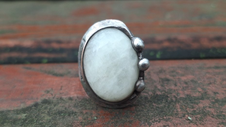 Pierścionek wykonany z miedzi, cyny i naturalnego kamienia księżycowego. Wymiary ok. 2.3 na 1.8 cm. Regulowany. Nie jest ciężki.