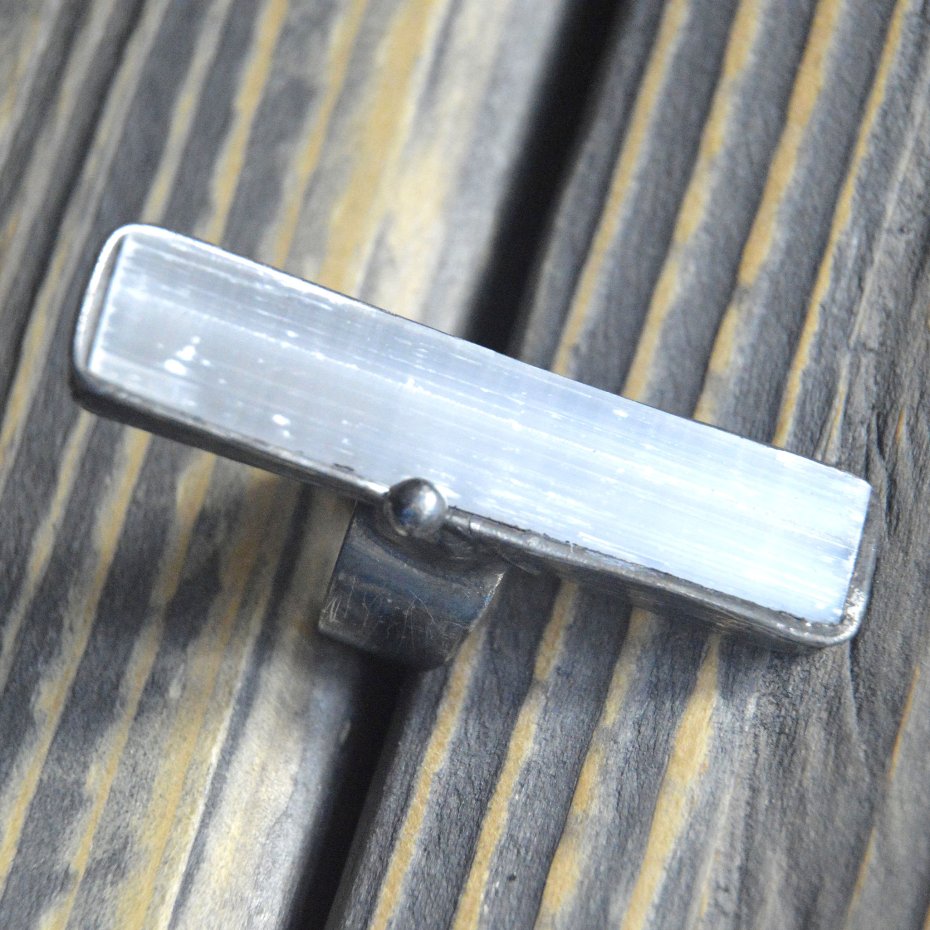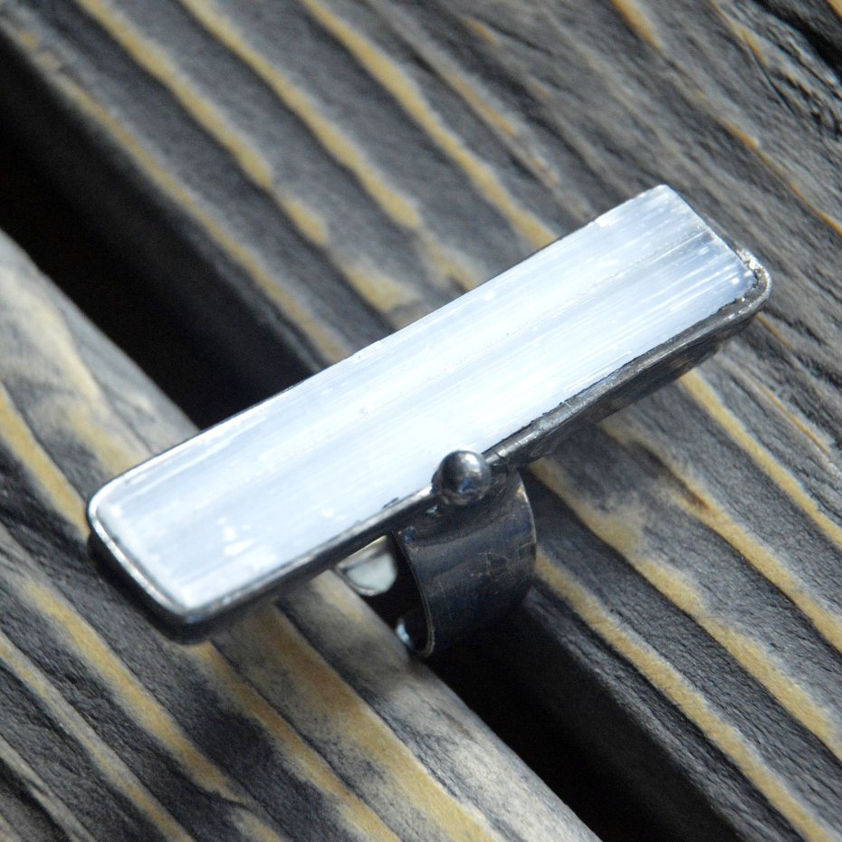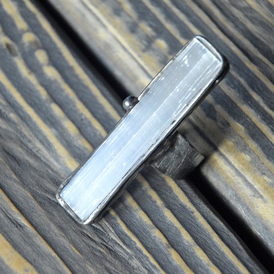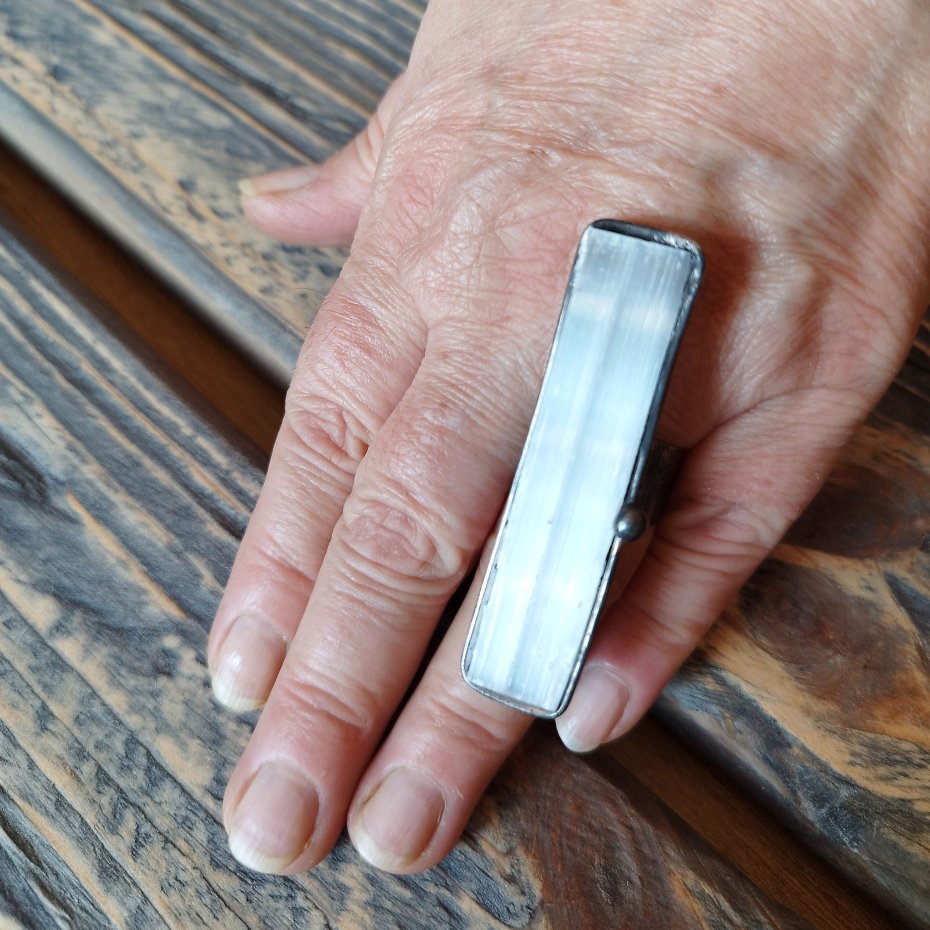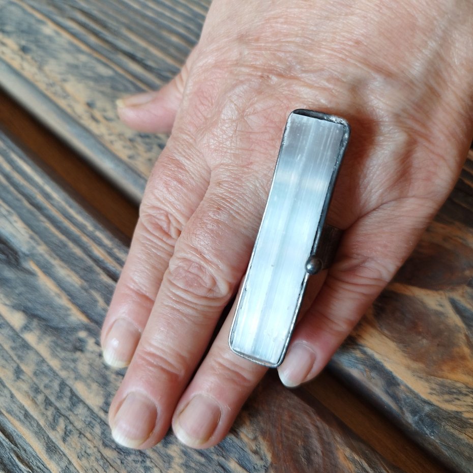 Artystyczny pierścionek wykonany z kryształu surowego selenitu nazywanego też kamieniem księżycowym oprawionego stopem cyny na miedzianej bazie. Rozmiary pierścionka to 1.5 x 6 cm , całość stylizowana na stare srebro i ręcznie polerowana. Pasuje na każdy palec - pierścionek posiada regulowaną obrączkę. Zapraszam do zakupu.