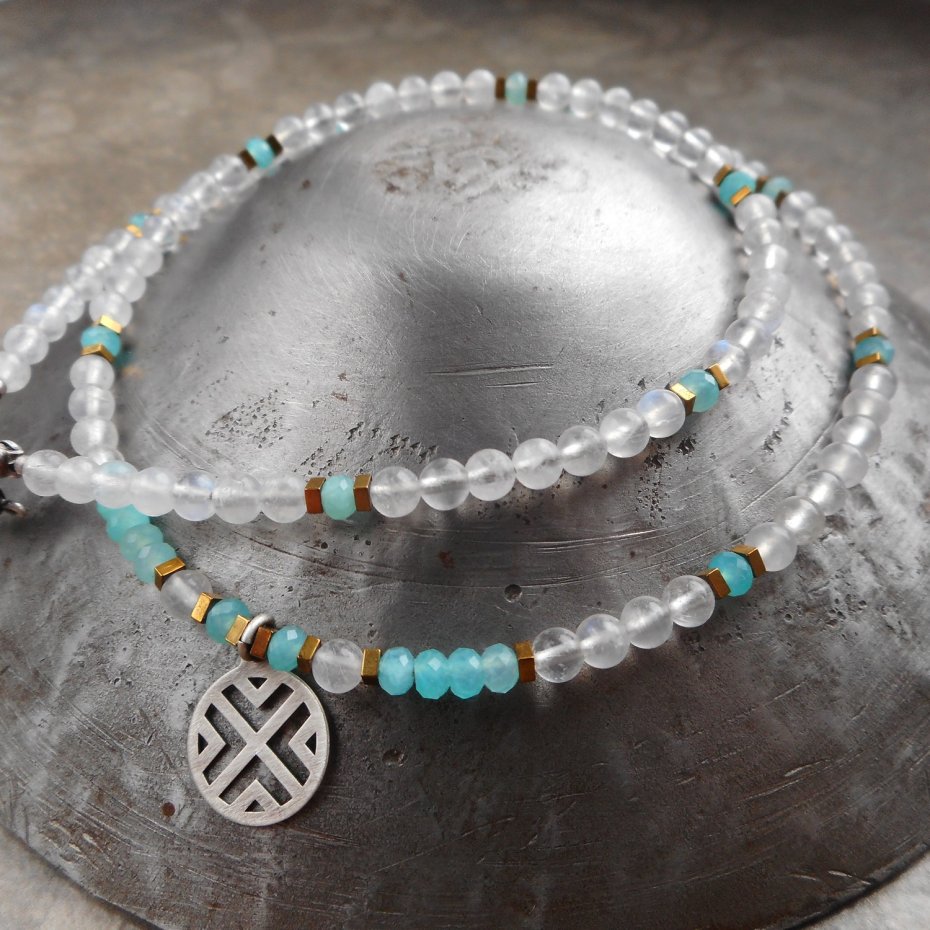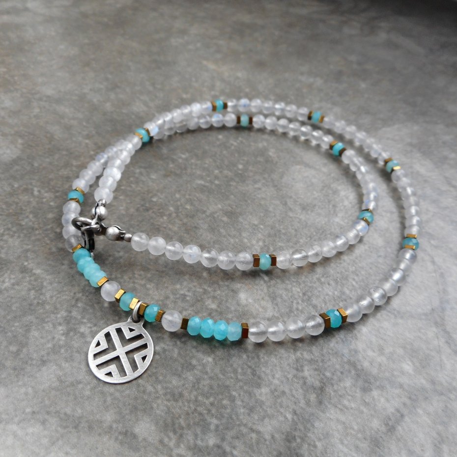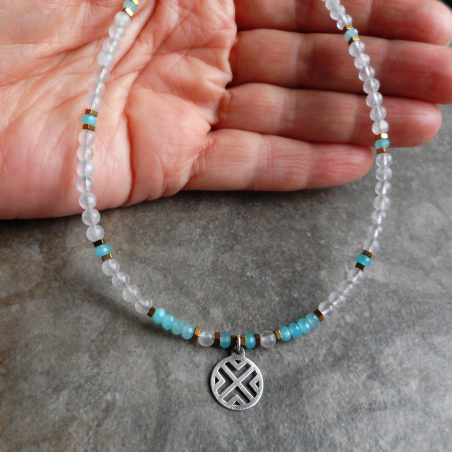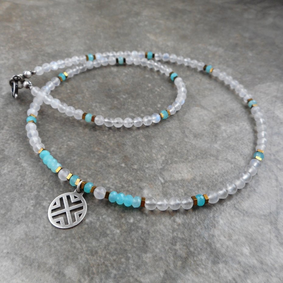 Piękny, krótki naszyjnik wykonany ze szlachetnego srebra i kamieni naturalnych; elegancki, lśniący, z połyskującymi błękitem kamieniami księżycowymi.