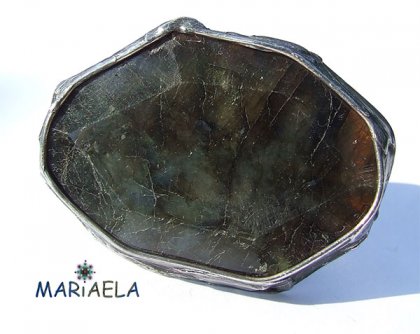 Zdjęcie oddaje prawdziwe piękno tego kamienia odwagi. Fasetowany labradoryt osadzony w cynowanej ramie. (cyna z dodatkiem srebra)