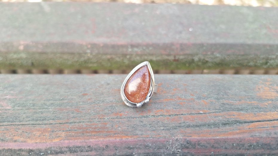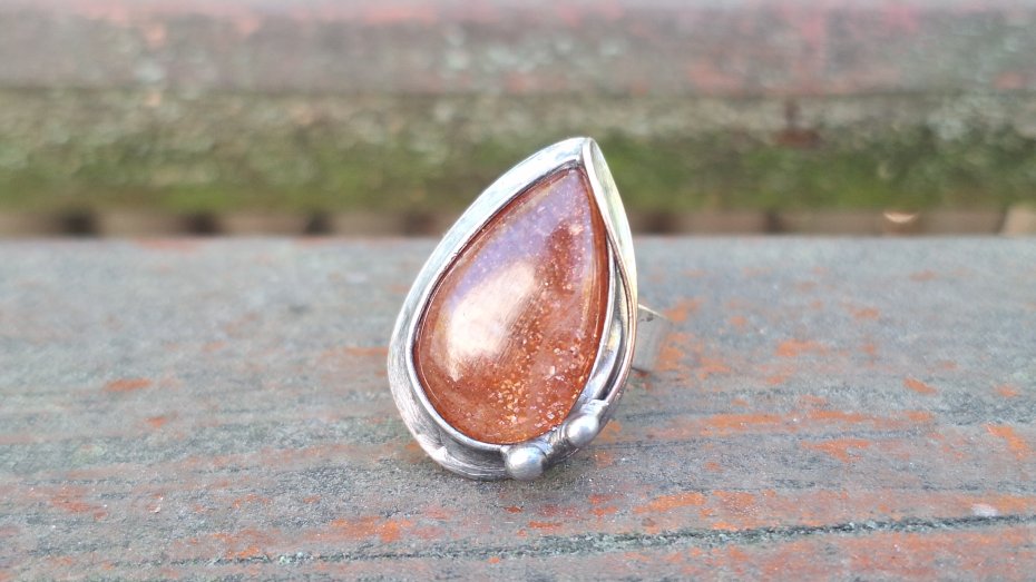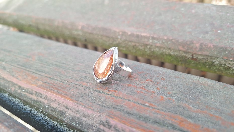 Pierścionek wykonany z miedzi, cyny i naturalnego kamienia słonecznego. Wymiary ok. 2.3 na 1.6 cm. Regulowany. Nie jest ciężki.