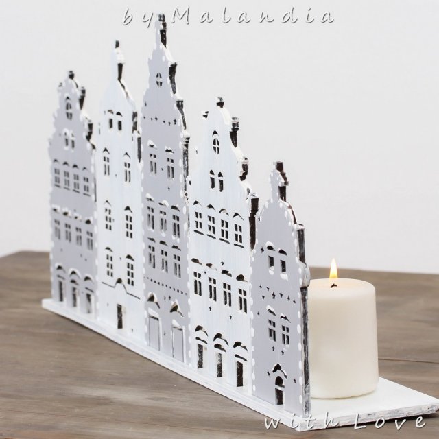 Urokliwe kamieniczki z podstawką, które chętnie ozdobią każdą półkę, kominek czy inne potrzebujące tego miejsce. Może też pełnić funkcję świecznika, postawione za nią tealighty wprowadzają niezwykły klimat. wysokość 24 cm szer 46 cm