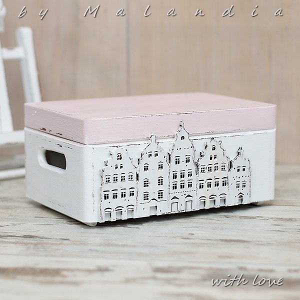 Zamykana drewniana skrzynka pomalowana metodą shabby chic, ozdobiona uroczymi kamieniczkami. Można w niej ukryć wiele drobiazgów, zdjęć.
