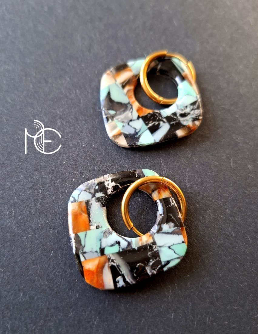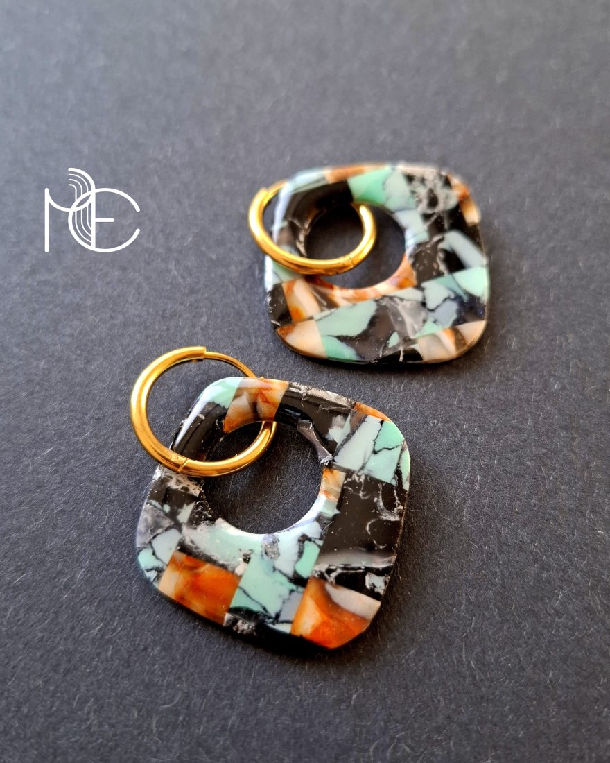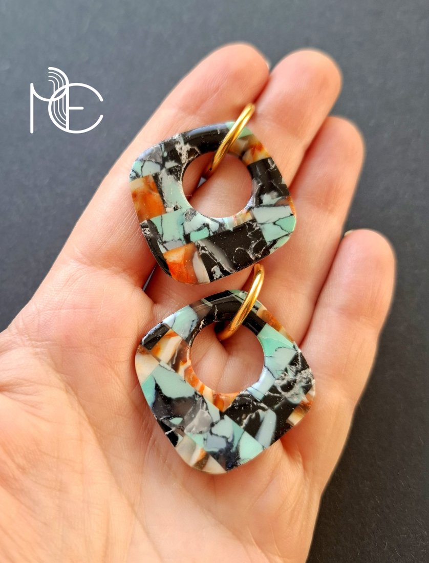 Kolczyki wiszące wykonane z wysokiej jakości glinki polimerowej z efektem półprzezroczystości. Bigle typu kajdanki - z zapięciem na zatrzask, pozłacane i nieuczulające ze stali szlachetnej. Kolczyki jednostronne i lekkie. Wymiary: długość całkowita - 4,5 cm, szerokość 3,5 cm. Wykonane w jedynym egzemplarzu.