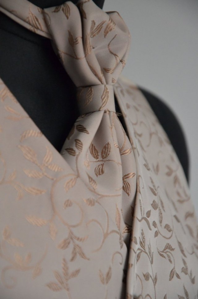 Elegancka kamizelka do garnituru. Kolor beżowy. Ozdobiona tłoczonym wzorem winorośli.