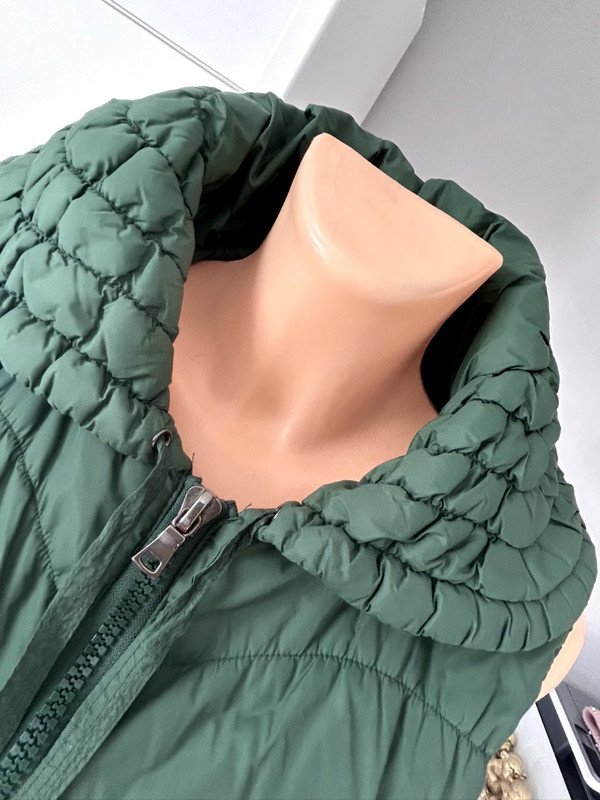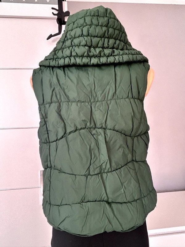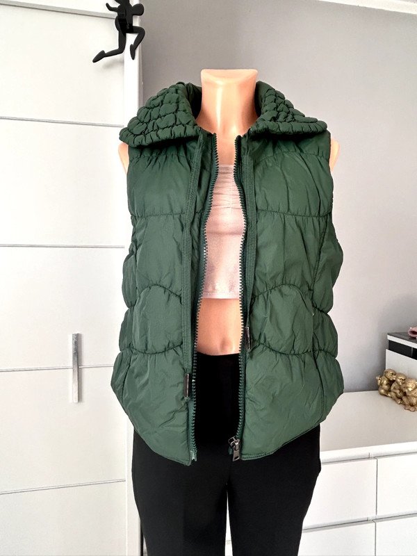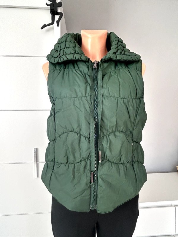 Kamizelka, bezrękawnik młodzieżowa firmy OVS Young. Rozmiar z metki to młodzieżowe/ dziecięce XL, ja określam ten rozmiar na damskie S/ M. Zasuwana na zamek, grafitowe okucia, wysoki kołnierz, piękny ciemnozielony butelkowy kolor.