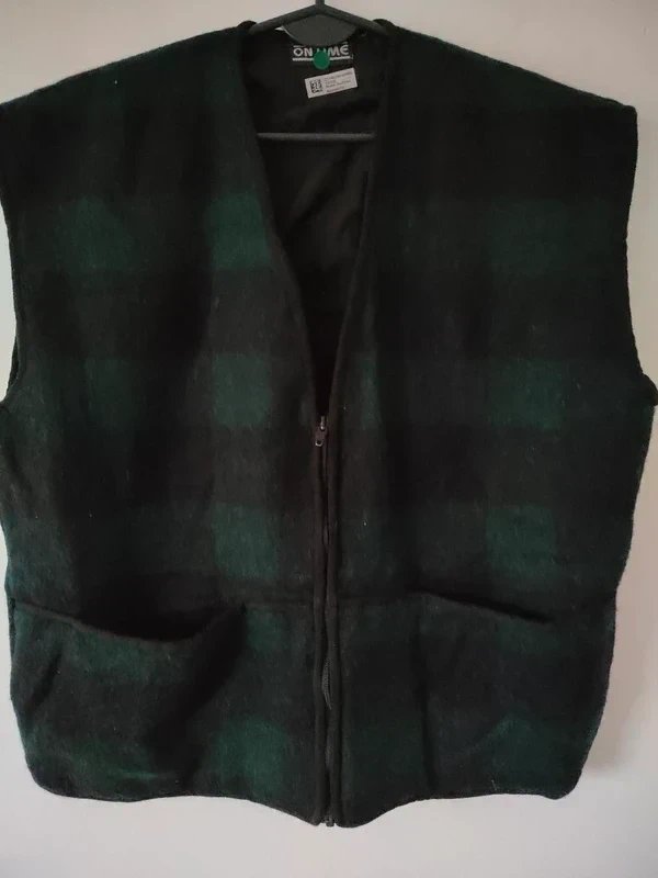 Klasyczna kamizelka/bezrękawnik wykonana z grubego, ciepłego materiału (prawdopodobnie wełna lub gruby polar/filc) w kultową, dużą, zielono-czarną kratę (tzw. Buffalo Check). Kamizelka jest zapinana na zamek błyskawiczny i ma dekolt w kształcie litery V. Posiada dwie duże, praktyczne kieszenie z przodu. Fason jest prosty i luźny (unisex).