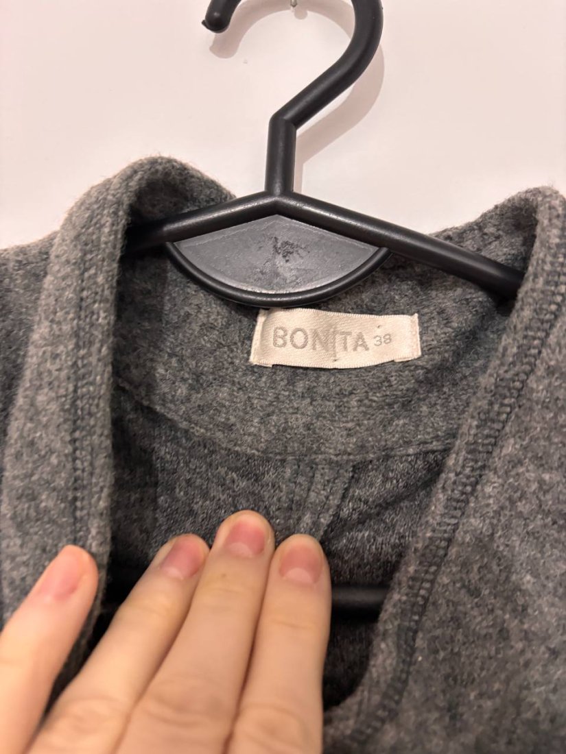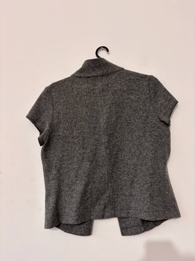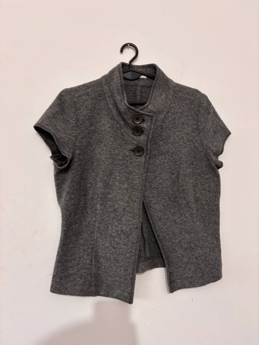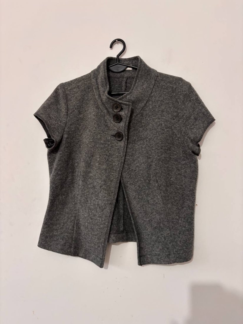 Elegancka kamizelka BONITA w odcieniu szarego melanżu, wykonana z miękkiej i ciepłej mieszanki wełny. Model z krótkim rękawem i ozdobnym kołnierzem zapinanymi na trzy duże guziki. Idealna do stylizacji smart casual, na koszulę, golf lub lekką bluzkę.