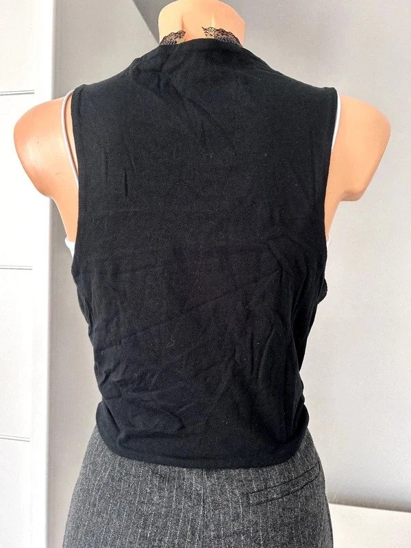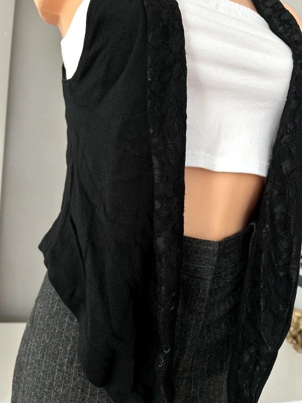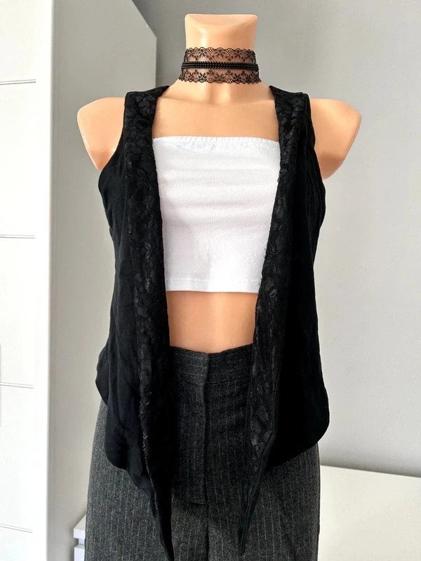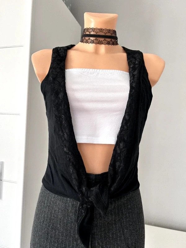 Czarna bawełniana kamizelka Calliope. Z przodu zdobiona koronką. Możliwość wiązania, w rozmiarze M.
