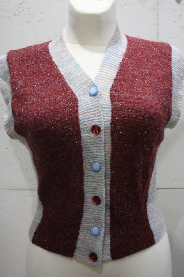 krótka kamizelka zapinana na kolorowe guziki, materiał z błyszczącą nicią, brak metki ze składem i rozmiarem
