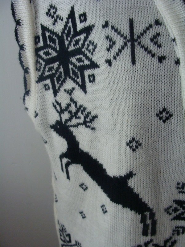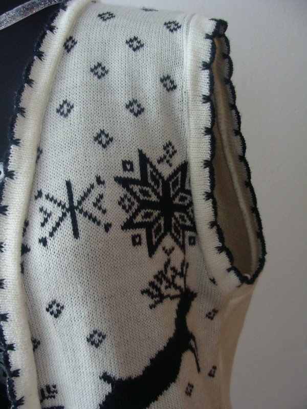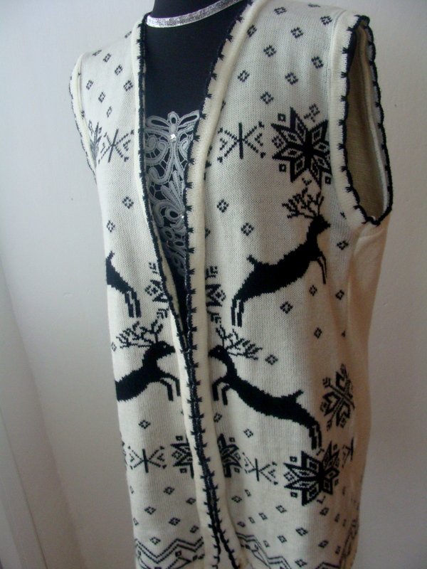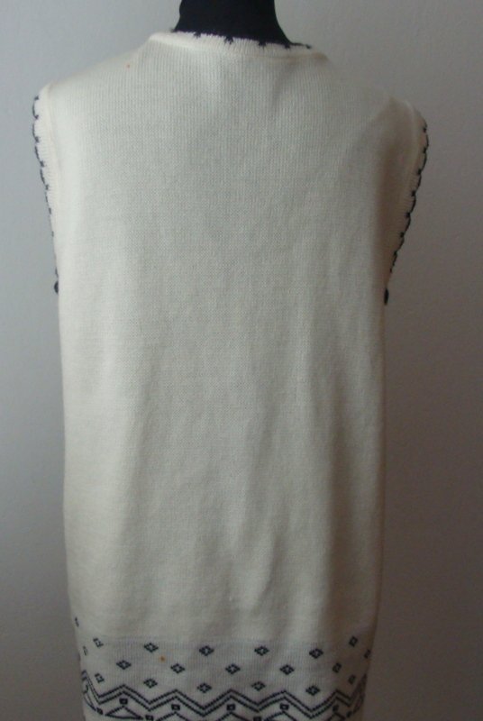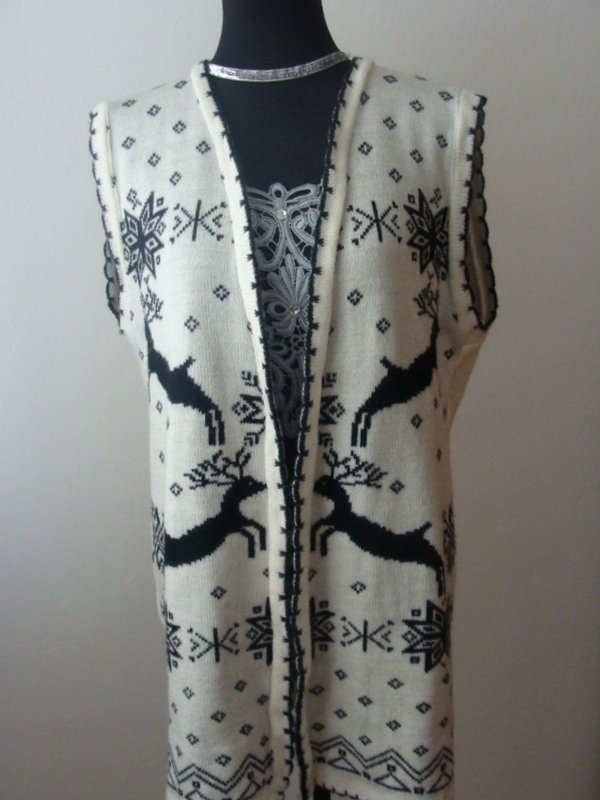 Kamizelka w kolorze złamanej bieli w etniczne wzory w czarnym kolorze. Fason prosty, luźny bez zapięcia.