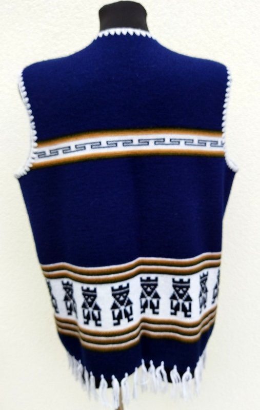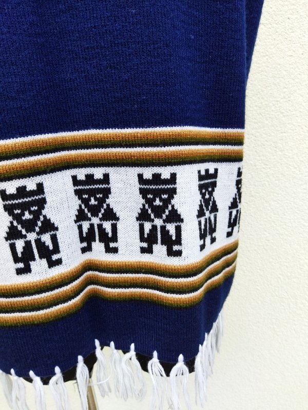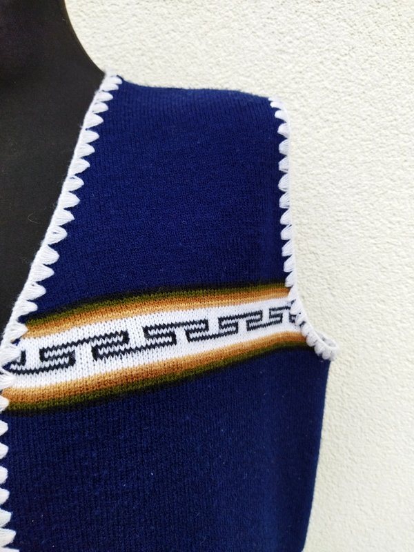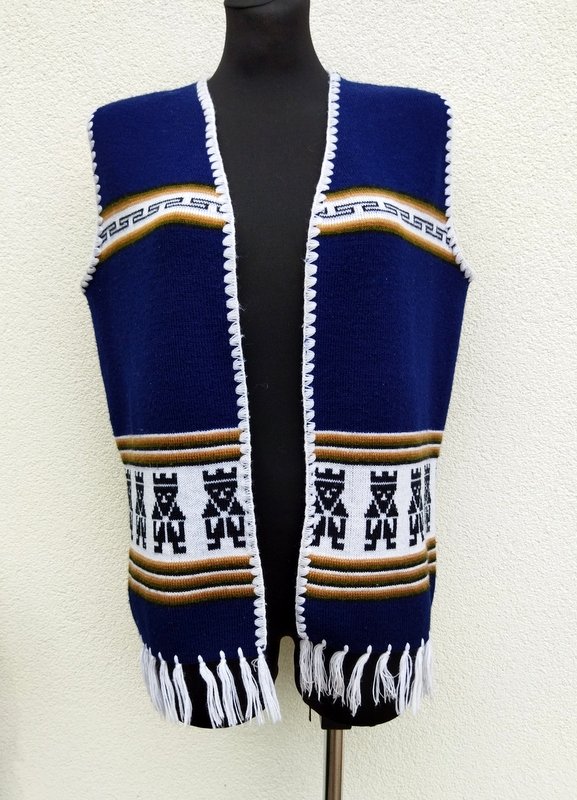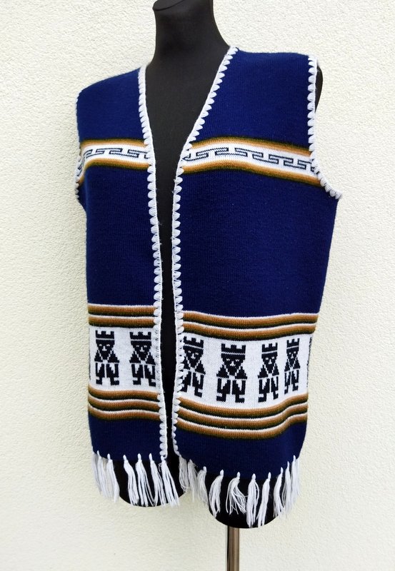 Kamizelka w ciemnogranatowym kolorze z etnicznymi wzorami w kolorach bieli, beżu, zgniłej zieleni i czerni. Wykończona frędzlami i szydełkowym wzorkiem. Fason otwarty - bez zapięcia.