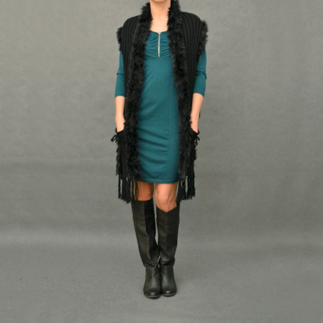 Świetna kamizela wykończona czarnym futerkiem (futerko jest całe czarne. Na zdjęciach wyszło czasami szarawe od poświaty lamp). Z tyłu krótsza, z przodu długa z kieszeniami. Na dole frędzle. Polecam.