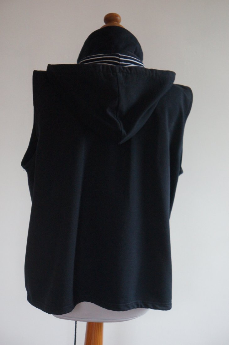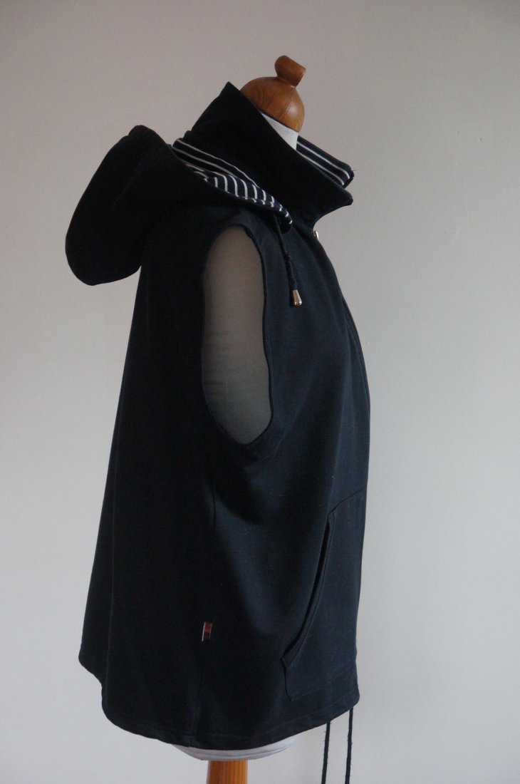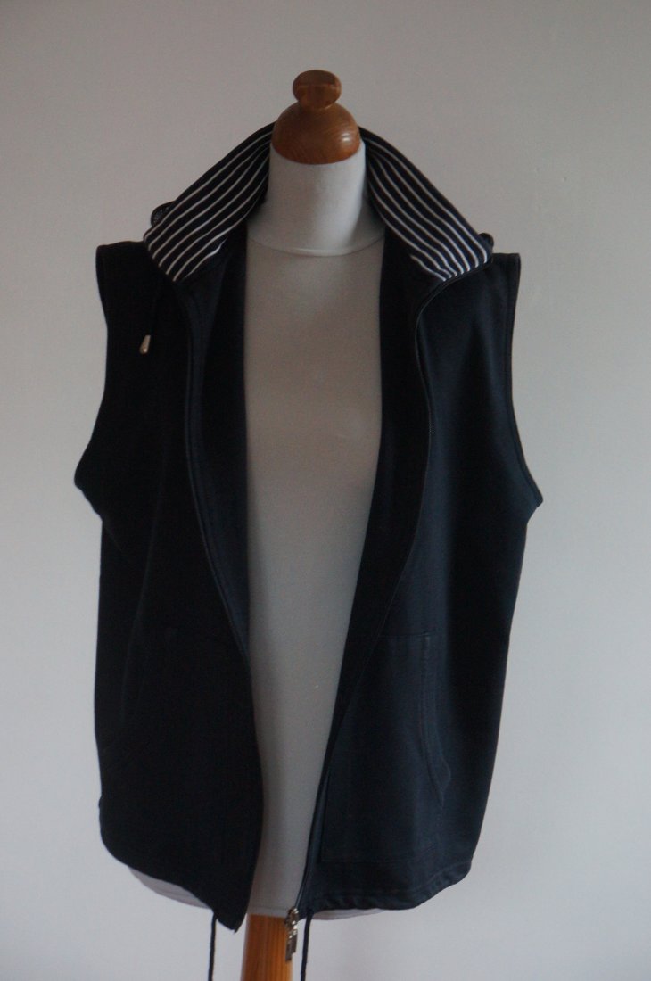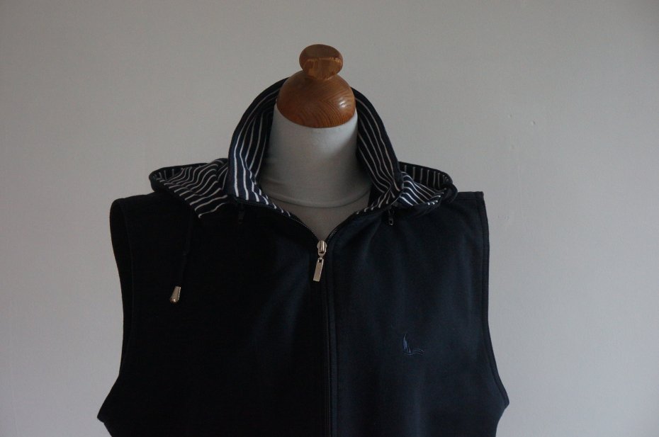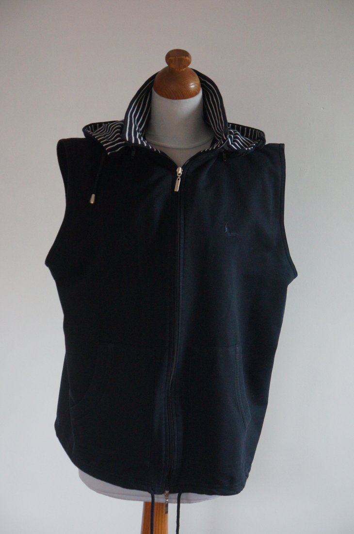 Kamizelka z odpinanym kapturem. Bezrękawnik. Stójka - wysokość 8 cm. Z przodu dwie wpuszczone kieszenie. Zapinana na suwak. Tkanina bawełniana z domieszką elastanu. Kolor granatowy z białymi akcentami. Stan bardzo dobry-.