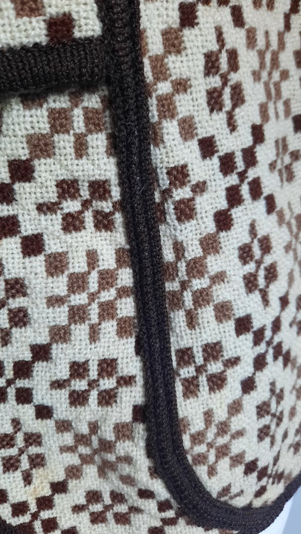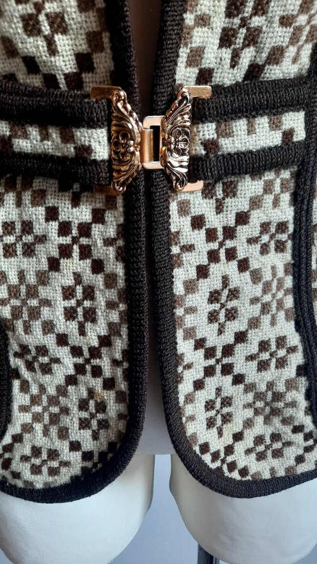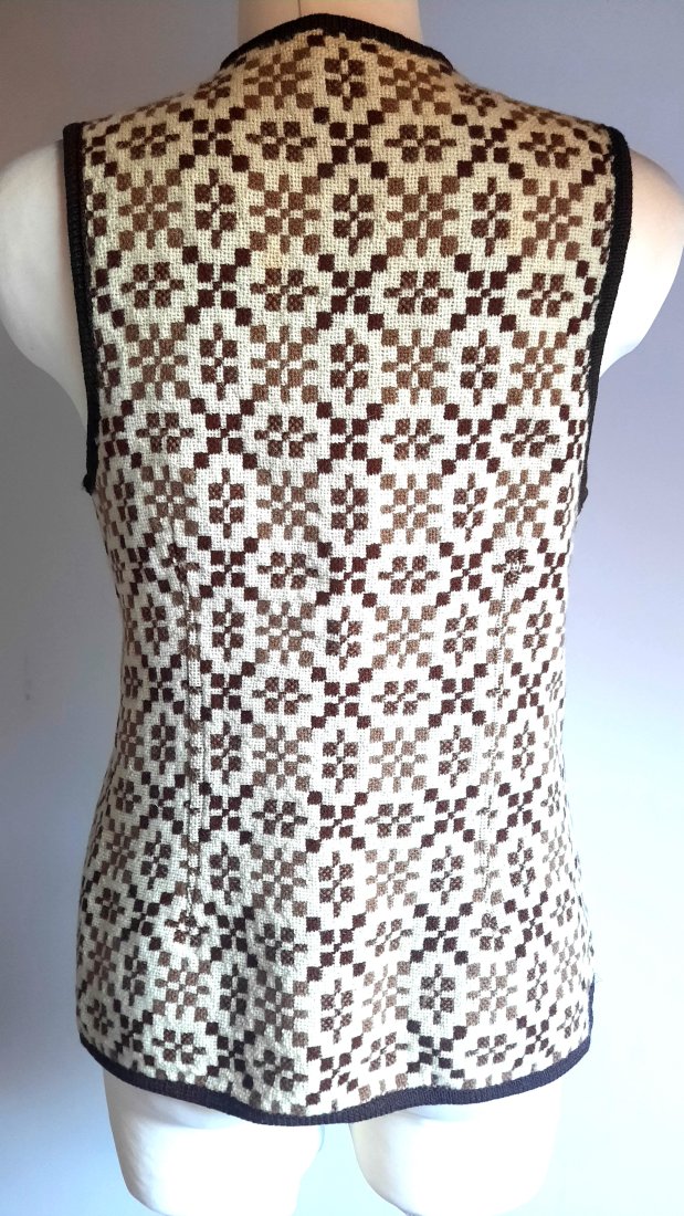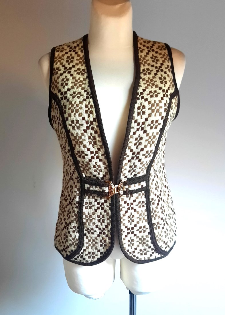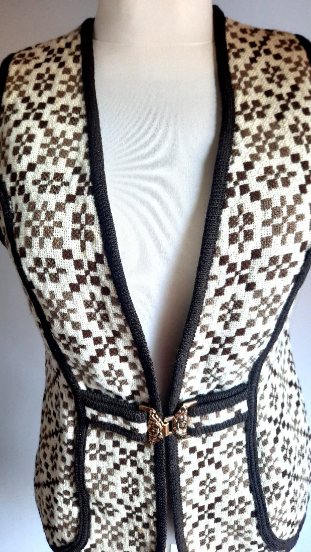 świetna wzorzysta wełniana kamizelka vintage z lat 60/70-tych w kolorze beżu i brązu, zapinana na metalową klamrę w kolorze starego złota, bez podszewki, wycięta metka ze składem i rozmiarem