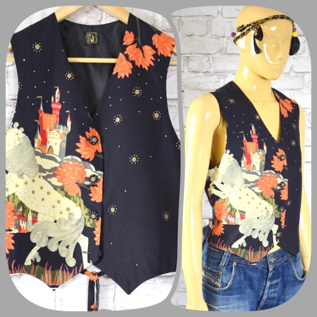 Świetna designerka kamizelka wykonana z bardzo przyjemnej tkaniny, jestem pewna, że to viscoza. Zapinana na powlekane guziczki, z przodu print zamku i chyba smoka, z tyłu kamizelka jest regulowana. Posiada podszewkę.