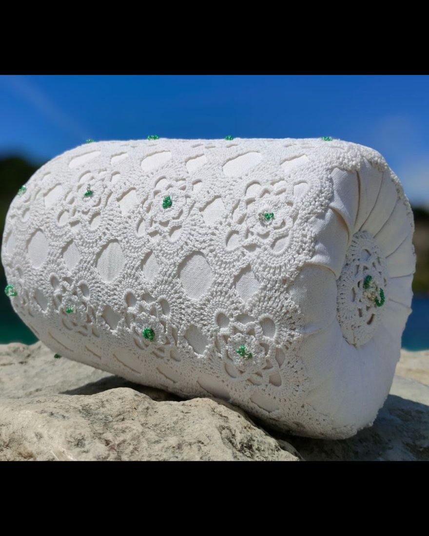 w zestawie poduszka wałek wykonany z lnu i ręcznie wykonanej koronki.