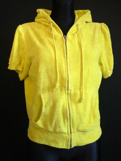 Bluza uszyta z froty w kolorze kanarkowym.Rękawy z bufkami. Dwie kieszenie z przodu. Zapinana na zamek. Podwójny kaptur ściągany tasiemkami.