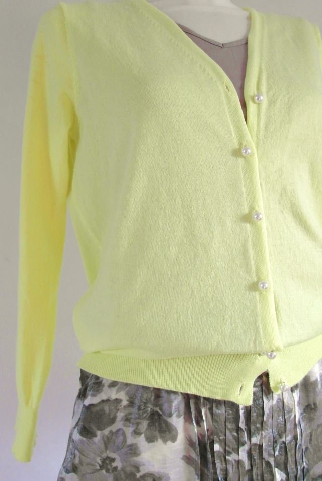 ożywiający kolor - kanarkowy, cytrynowe lody.. zapinany na kuleczki perłowe.pasuje do wielu kolorów - biel, szarość, beż, taupe, khaki, granat, srebro.