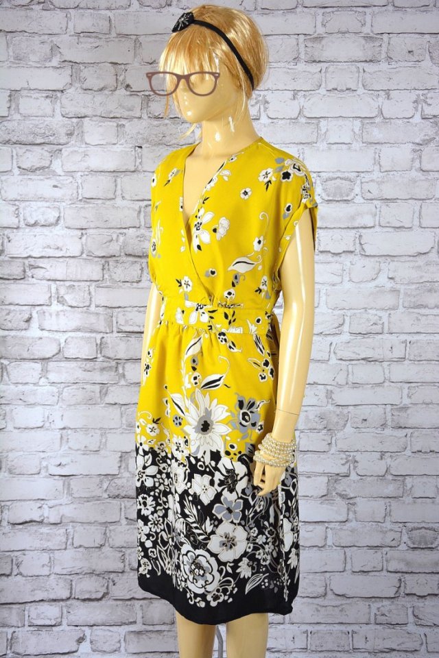 Śliczna kanarkowa sukienka o poszerzanym kroju w kwiatuszki, dekolt kopertowy, poniżej linii dekoltu w pasie wiązana, w dolnej części mocno poszerzana.Dominujące kolory :żółty, biały,czarny,szary, beżowy. Idealna do luźnych , niezobowiązujących stylizacji.