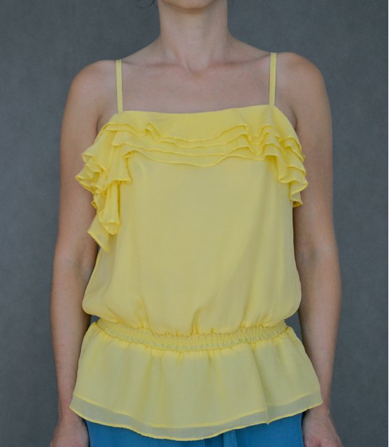 Piękna jedwabna bluzeczka w kanarkowym, żółtym kolorze. Na regulowanych ramiączkach, w talii gumka. Góra ozdobiona falbankami. 100%JEDWAB.
