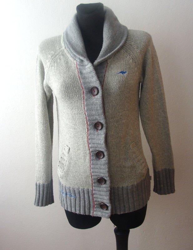 Akrylowy sweter w odcieniach szarości ożywiony czerwienia wzdłuż zapięcia. Szalowy kołnierz, rękawy raglanowe, zapinany na guziki, wykończony ściągaczami. Skład; 100% akryl