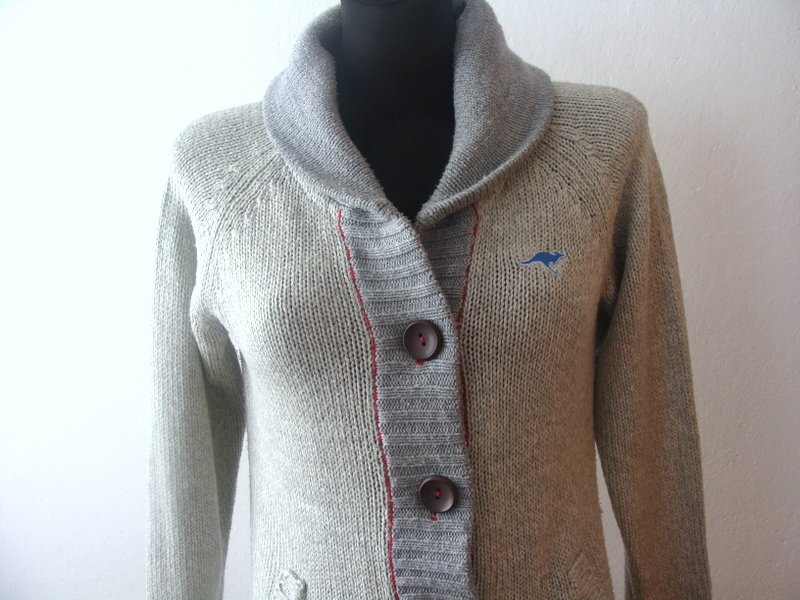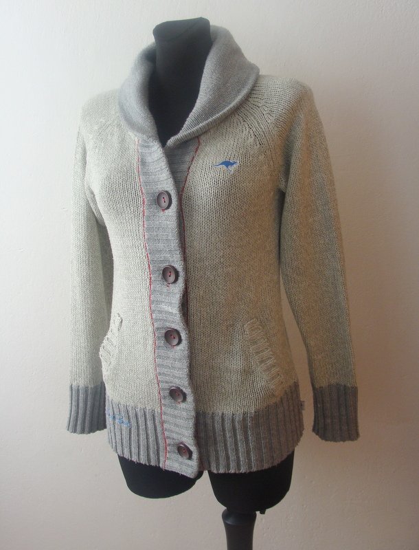 Akrylowy sweter w odcieniach szarości ożywiony czerwienia wzdłuż zapięcia. Szalowy kołnierz, rękawy raglanowe, zapinany na guziki, wykończony ściągaczami. Skład; 100% akryl
