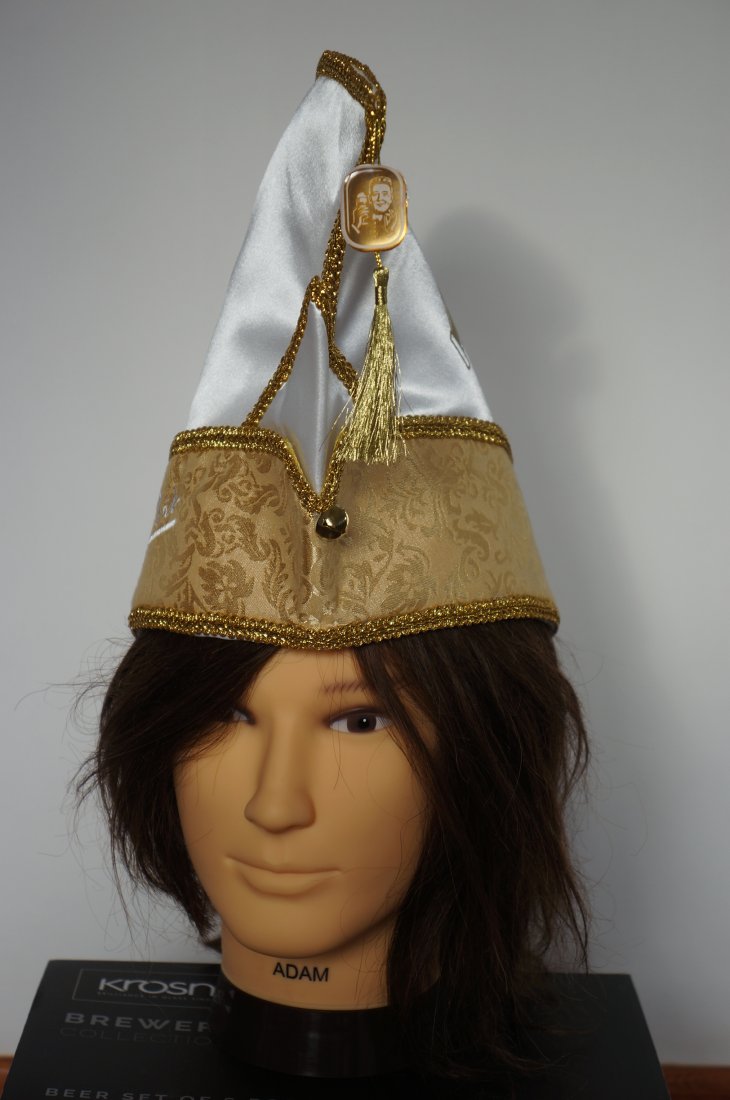 Kapelusz/przebranie komitetu Bitburgera w kolorze białym ze złotymi dodatkami. Doskonały dodatek do kostiumu na imprezy tematyczne. Tkanina 100% poliester. Przedmiot nowy. Stan bardzo dobry.