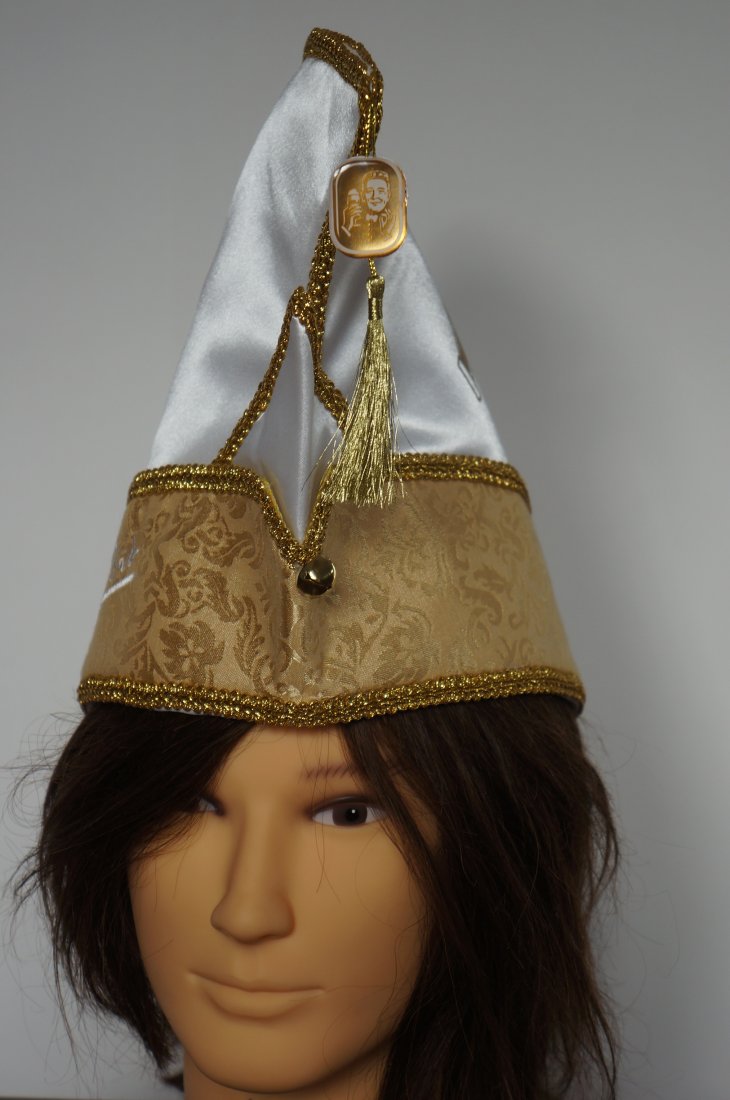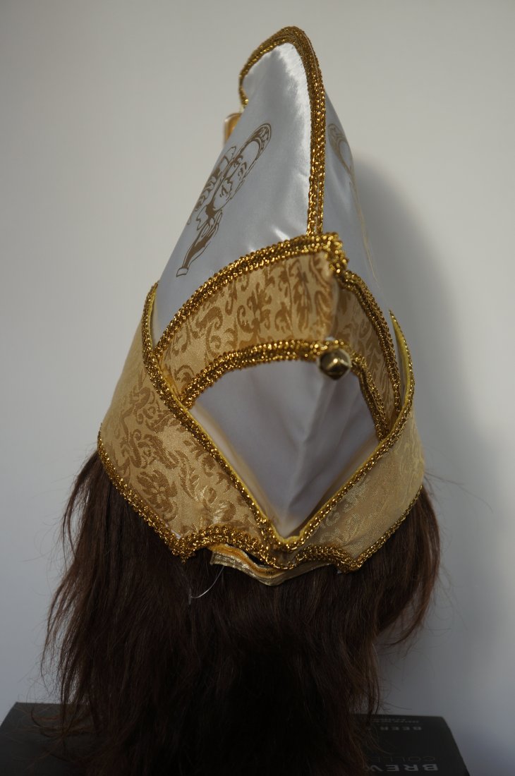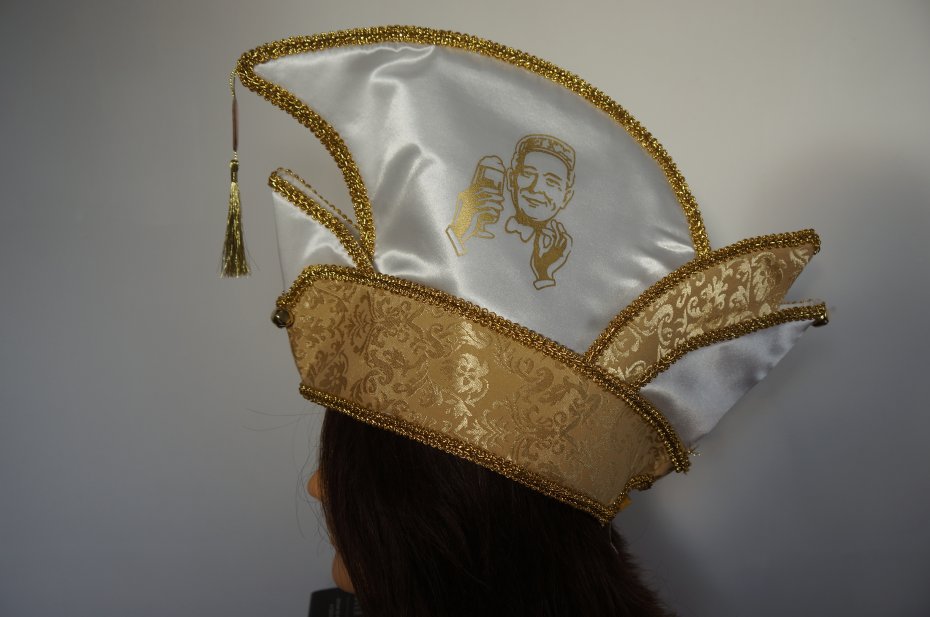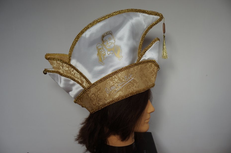 Kapelusz/przebranie komitetu Bitburgera w kolorze białym ze złotymi dodatkami. Doskonały dodatek do kostiumu na imprezy tematyczne. Tkanina 100% poliester. Przedmiot nowy. Stan bardzo dobry.