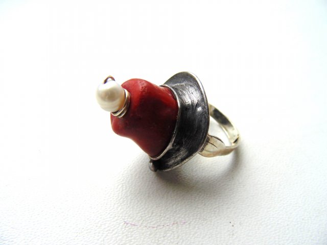 Pierścionek wykonany techniką witrażową z koralowca i perły słodkowodnej. Obrączka posrebrzana, regulowana. Wymiary ok. 2,3 na 2,3 cm. W górę ok. 2 cm z perłą.