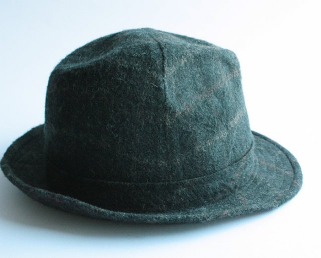 Kapelusz z małym rondem, w ciekawy, ledwie widoczny wzór. Kolor to czerń z kroplą ciemnej zieleni. Posiada podszewkę.