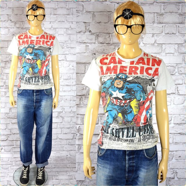 Świetna biała bawełniana bluzka w komiksowy print Kapitan Ameryka, tył gładki biały. Dominujące kolory : biel,czerwień,żółty, niebieski,szary.