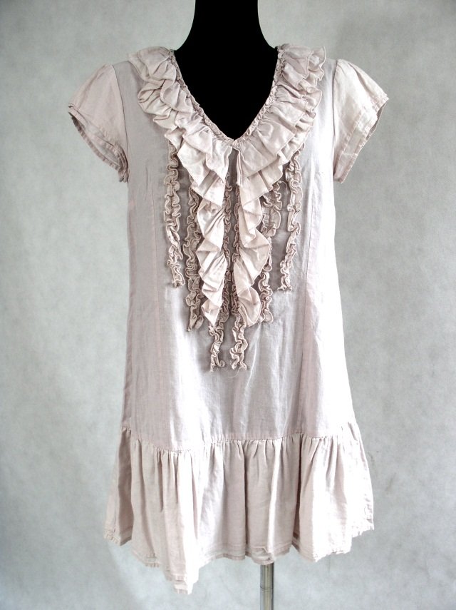 Sukienka-tunika firmy KappAhl.Rozmiar 36.Materiał lekka bawełna.Dekolt w literę V,obszyty podwójną falbaną.Środek przodu z naszytymi falbankami.Mały,podwójny rękawek.Dół zakończony podwójną falbaną.Stan bardzo dobry.Długość 81 cm.pod pachami 96 cm.Kolor beżowy róż.