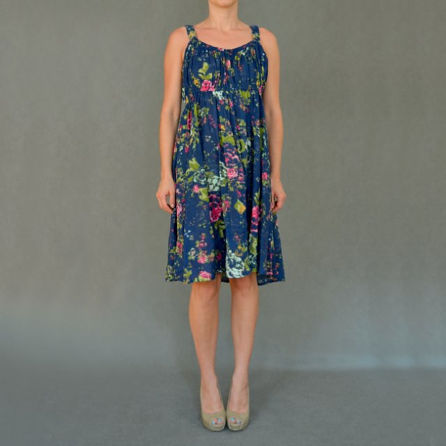 Letnia sukienka od KAPPAHL. Granatowa w kwiaty. Odcięta pod biustem. Bez podszewki. Materiał przewiewny.