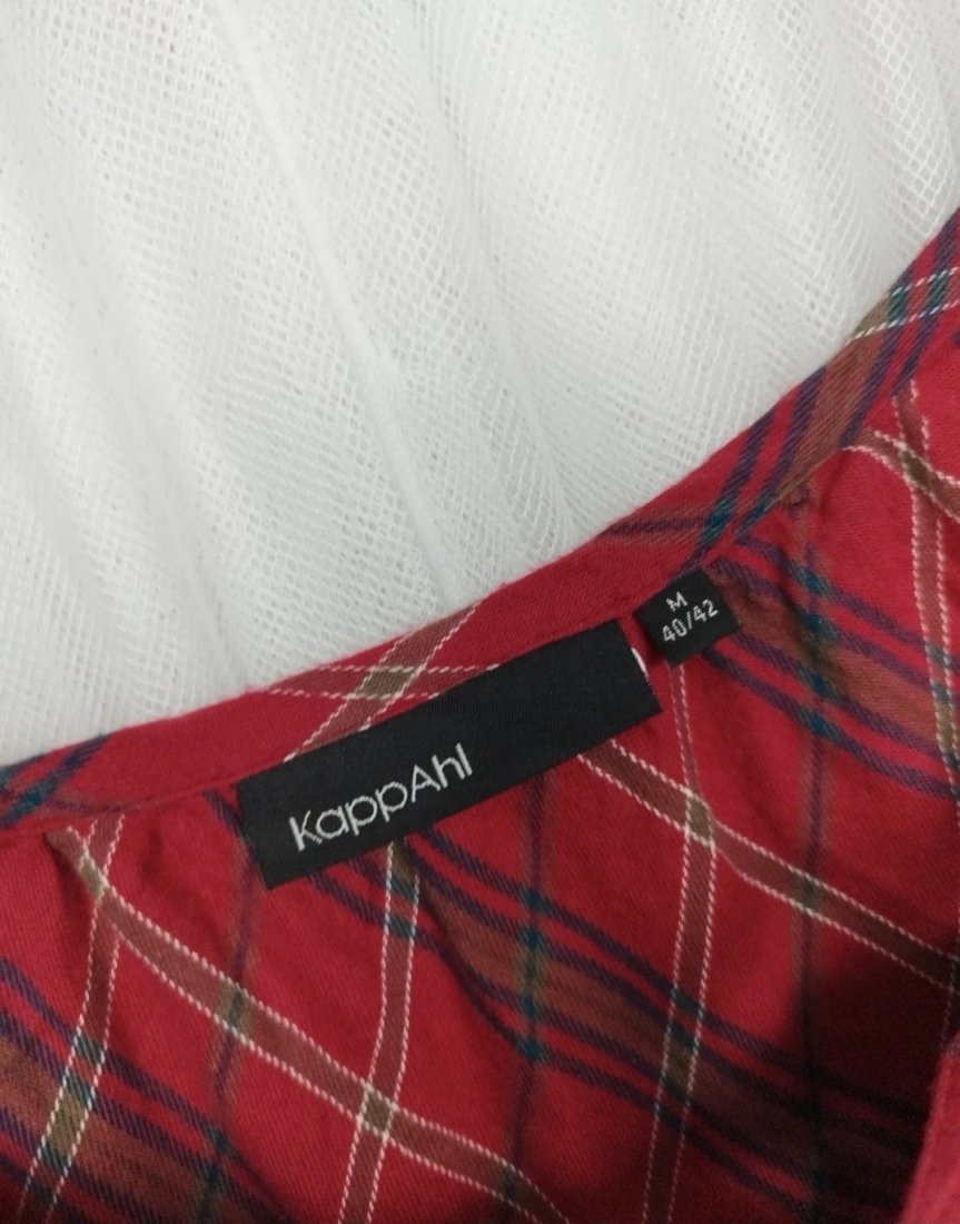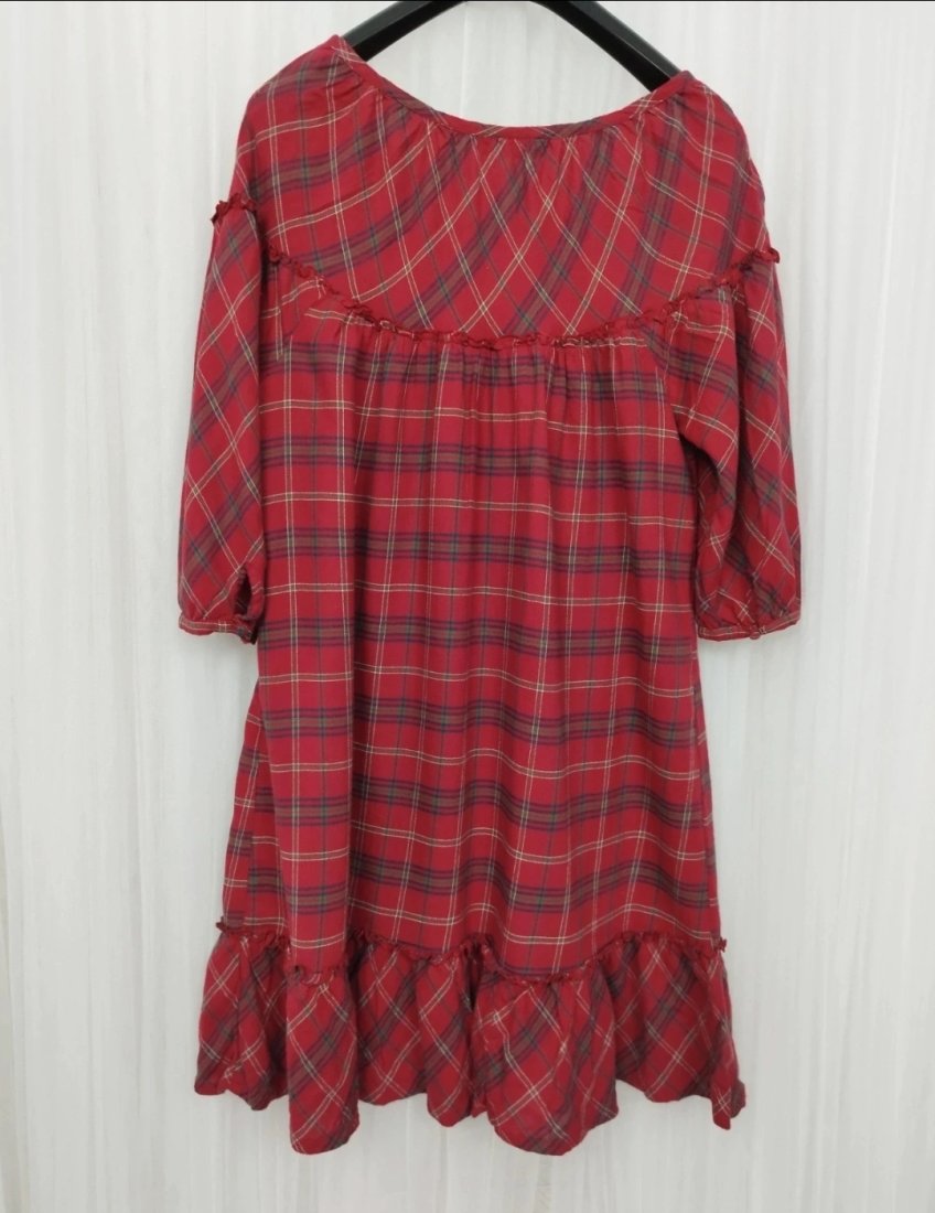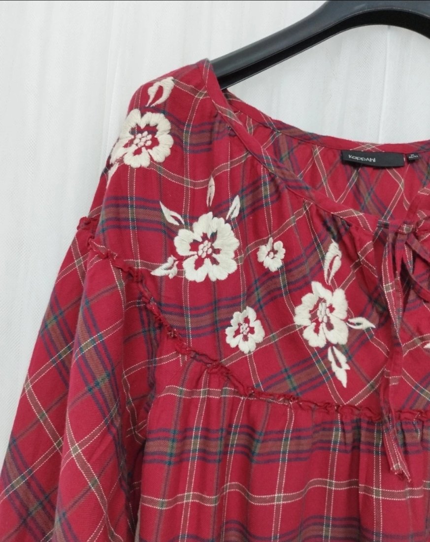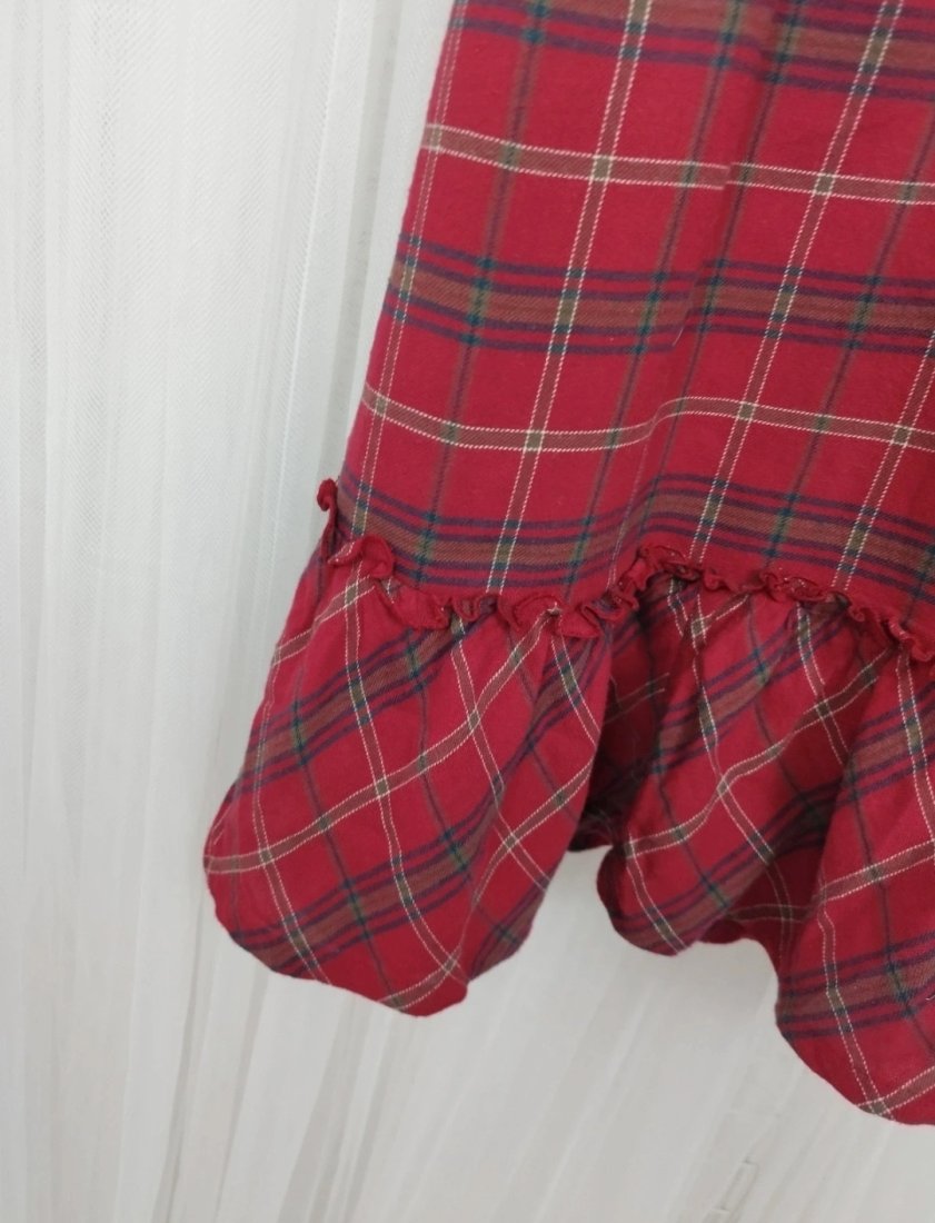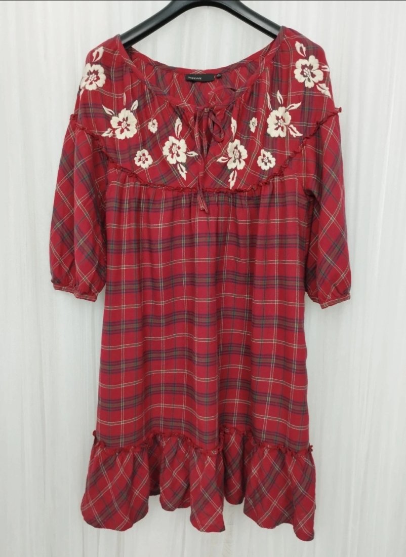 Czerwona w delikatną kratkę, kremowe haftowane kwiaty. Falbana na dole.