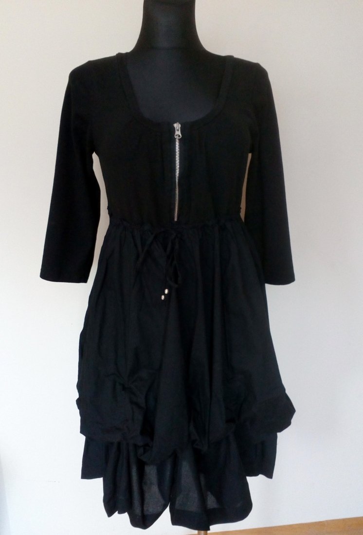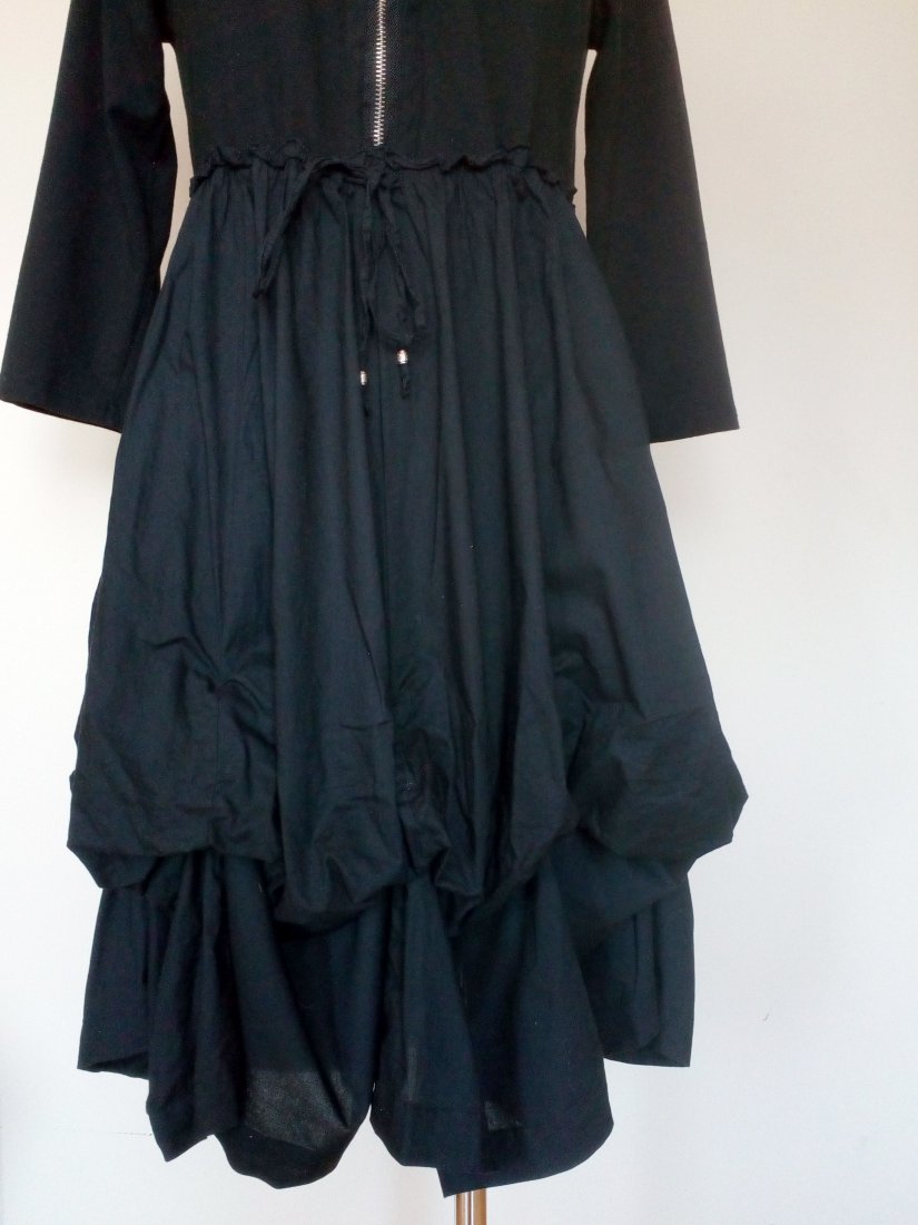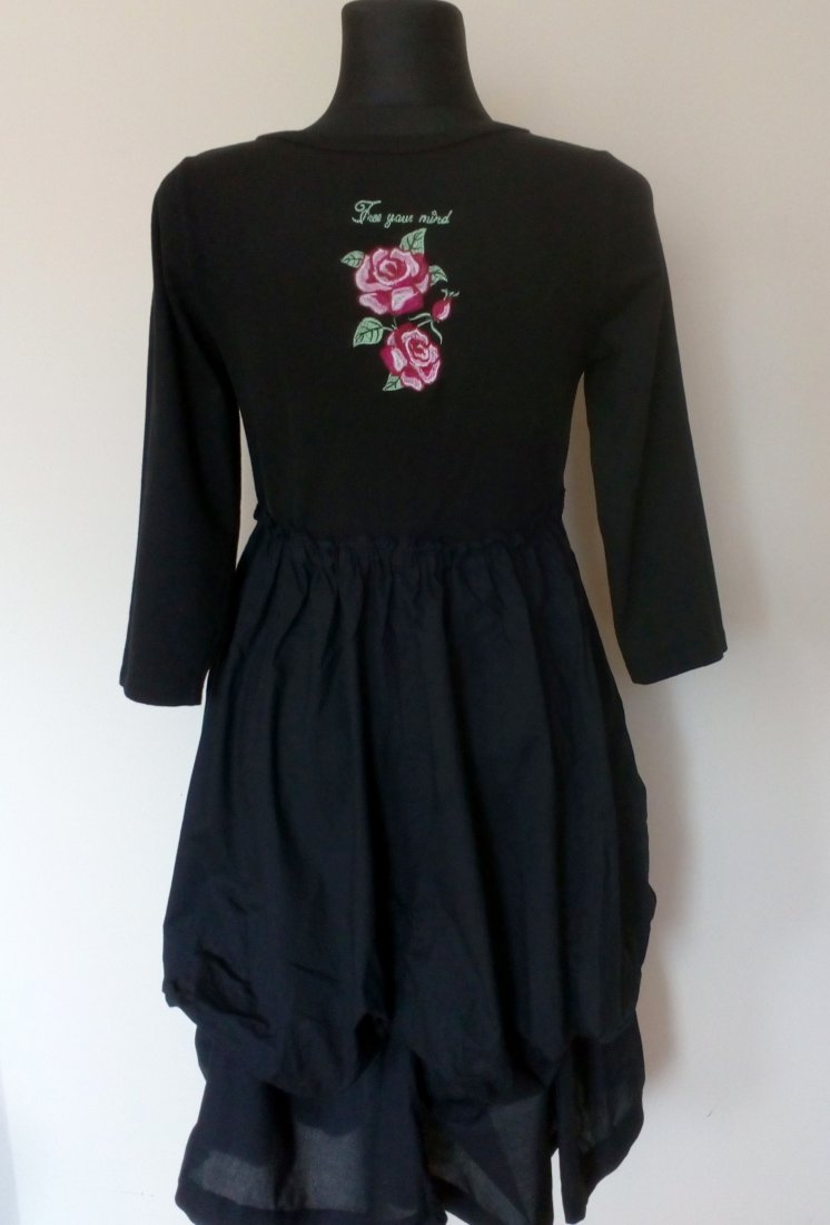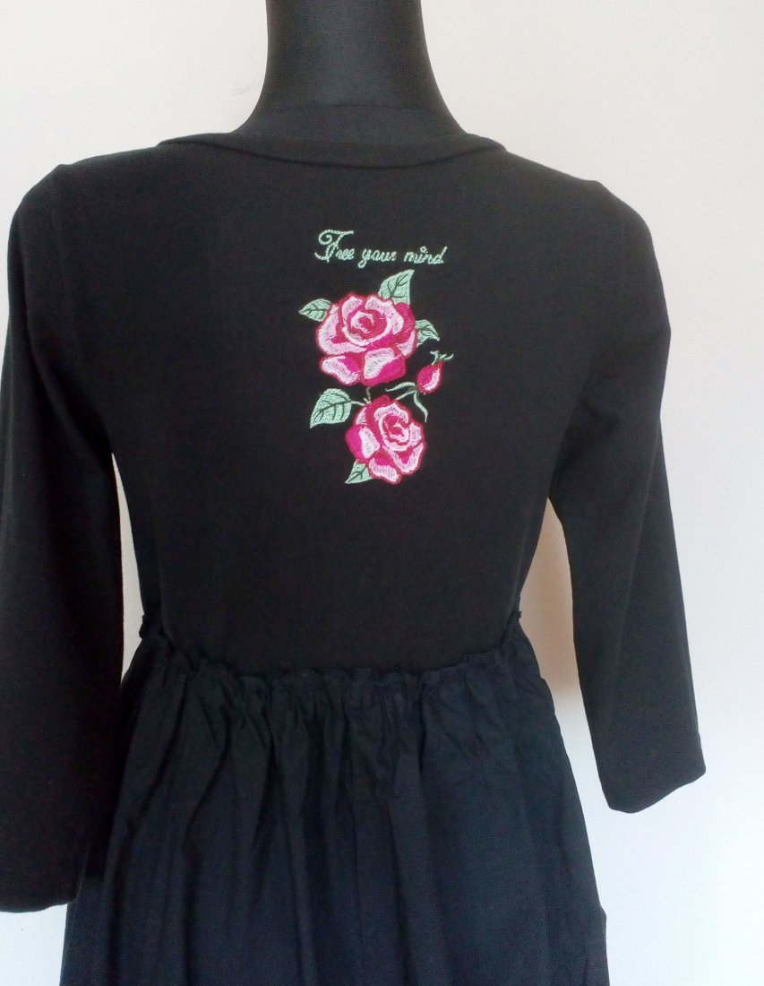 Czarna sukienka z haftem na plecach, zapinana z przodu na metalowy zamek, odcinana w pasie, w miejscu zszycia drobna falbanka, rękaw 3/4, dół sukienki podwiązywany od środka trokami, góra sukienki z dzianiny, dół z tkaniny bawełnianej