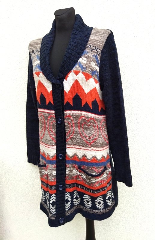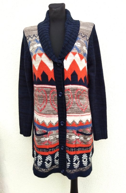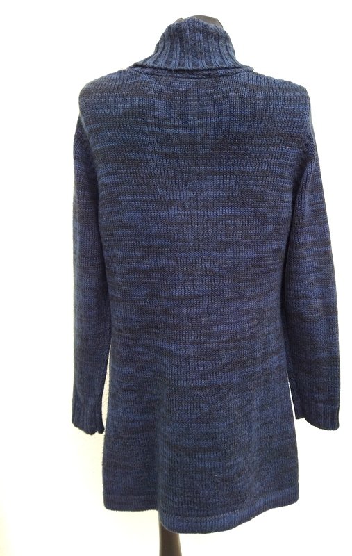 Dłuższy sweter z akrylowej włóczki w melanżowym granatowym kolorze z czernią, z wzorzystym przodem . Trapezowy fason lekko poszerzany do dołu, z szalowym kołnierzem, z dwiema naszywanymi kieszeniami. Zapinany na całej długości na guziki.