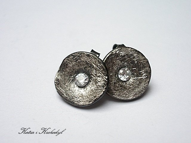 Kolczyki - sztyfty wykonane ręcznie od podstaw ze srebra [pr. 925] w połączeniu z cyrkoniami [3mm ]. Średnica talerzyków [12-13mm] . Srebro oksydowane ,przetarte i miejscami mocno satynowane. .Biżuteria ozdobnie zapakowana