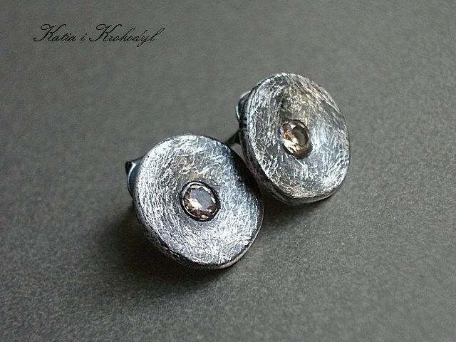 Kolczyki - sztyfty wykonane ręcznie od podstaw ze srebra [pr. 925] w połączeniu z cyrkoniami [3mm ]. Średnica talerzyków [12-13mm] . Srebro oksydowane ,przetarte i miejscami mocno satynowane. .Biżuteria ozdobnie zapakowana