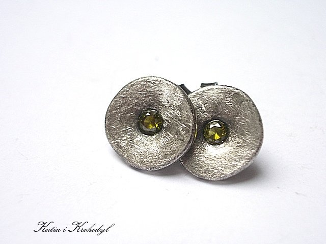 Kolczyki - sztyfty wykonane ręcznie od podstaw ze srebra [pr. 925] w połączeniu z cyrkoniami [3mm ]. Średnica talerzyków [12-13mm] . Srebro oksydowane ,przetarte i miejscami mocno satynowane. .Biżuteria ozdobnie zapakowana