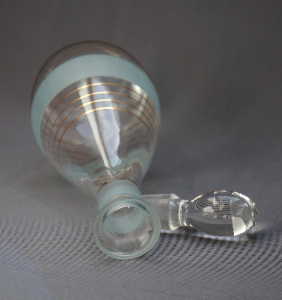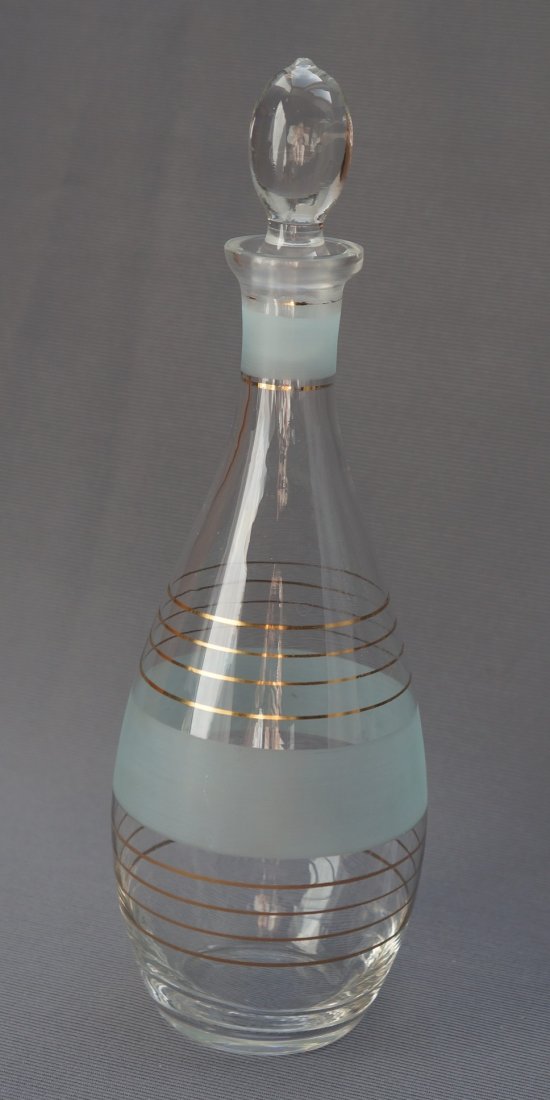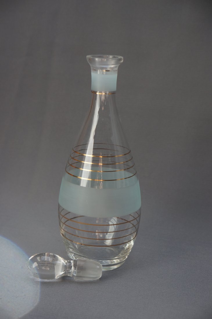 Szklana karafka z Huty Szkła Ząbkowice. Autorem projektu jest Wiesław Sawczuk. Elegancki, tradycyjny kształt kropli. Szkło bezbarwne, zdobione matowymi, szerokimi pasami i złotymi delikatnymi obwódkami. Korek solidny, pełny. Vintage. Lata 60-te XX wieku. Stan bardzo dobry.